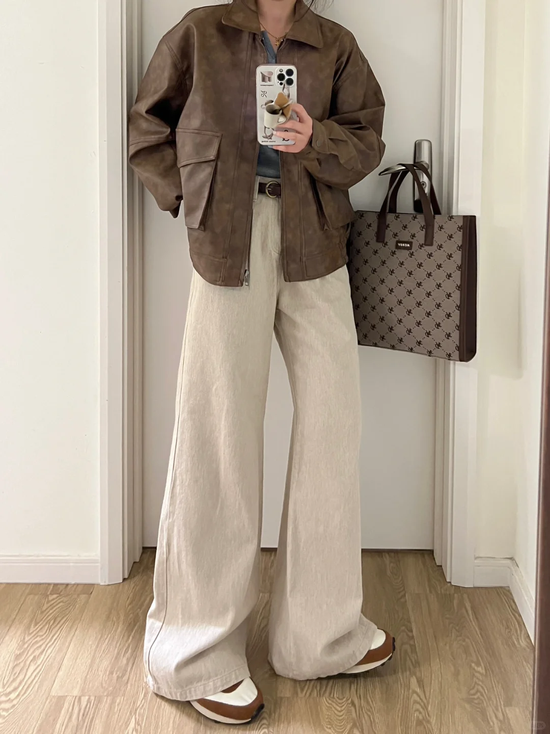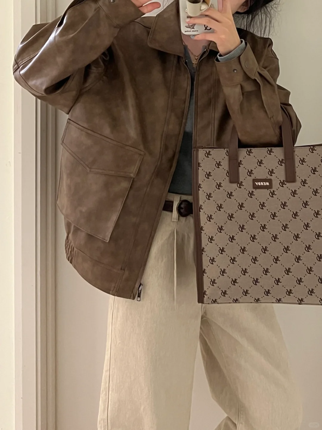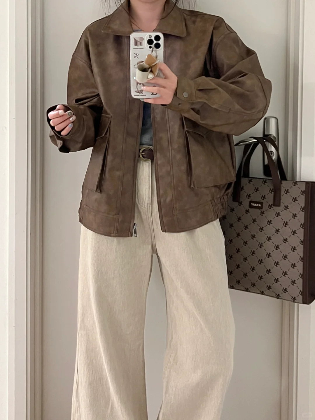 早春复古休闲|咖色皮衣外套+灰杏直筒牛仔裤