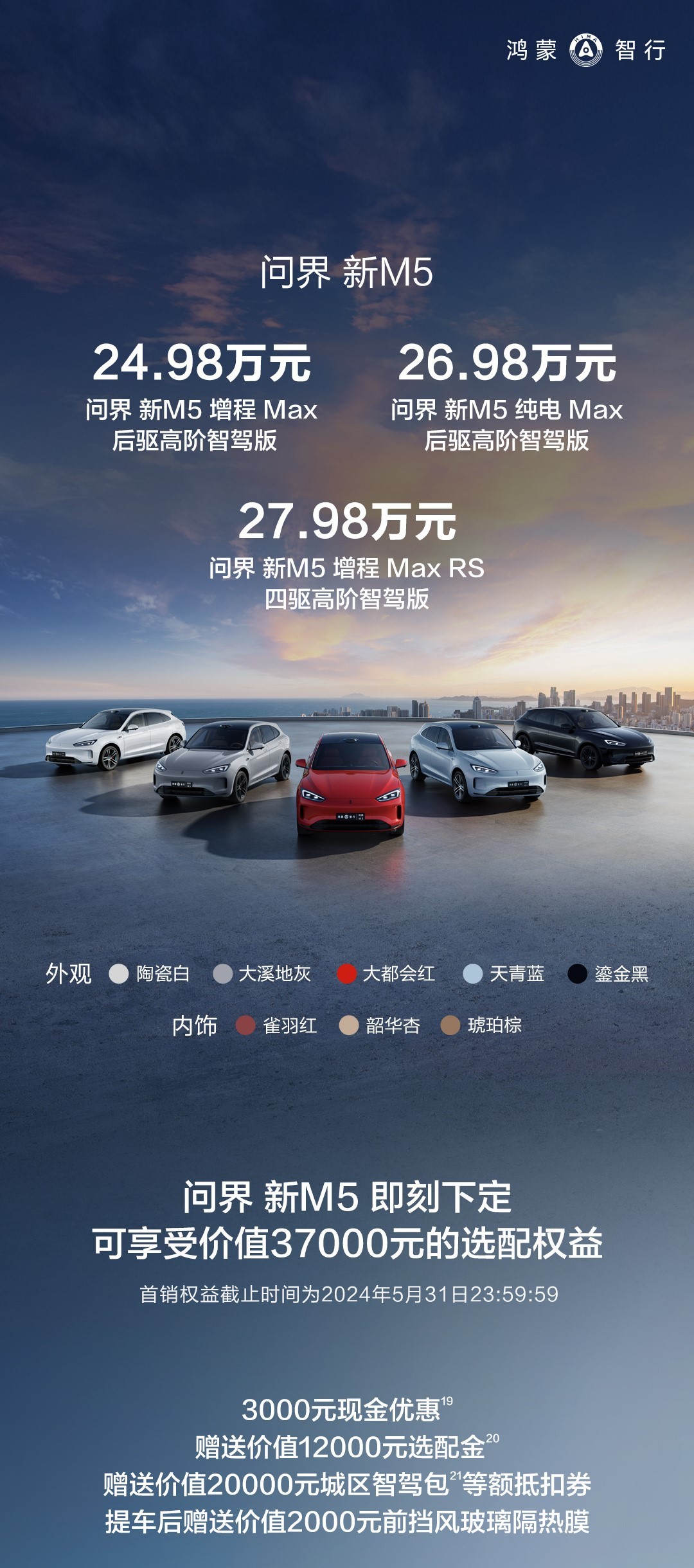 腾势N7和问界M5新款,高阶智驾款定价起步价完全一致了,都是24.98万元可带激光雷达高阶智驾,一个纯电车型,一个增程模式。问界 新M5纯电Max版则起步价在26.98万元起。