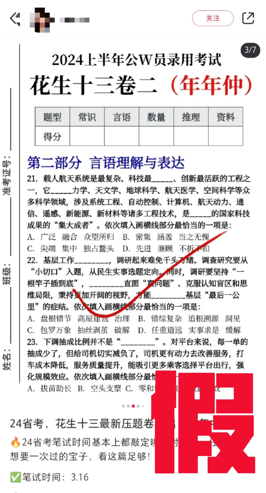 声明一下,从来没有弄过什么内部预测卷 目前在上的只有省考套题班,用的都是历年的题 大家注意甄别,谨防上当受骗。