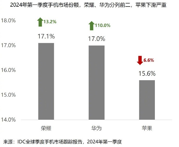 #兽数码[超话]#2024年Q1荣耀份额以微弱优势第一,华为增长110%,第二