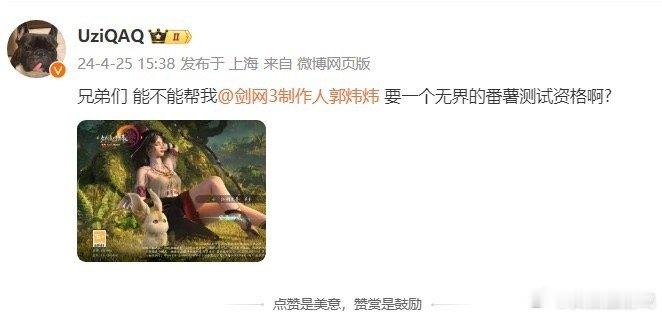 就在刚刚Uzi更新微博,喊话剑网3制作人,原文如下:兄弟们,能不能帮我,要一个无界的测试资格啊?