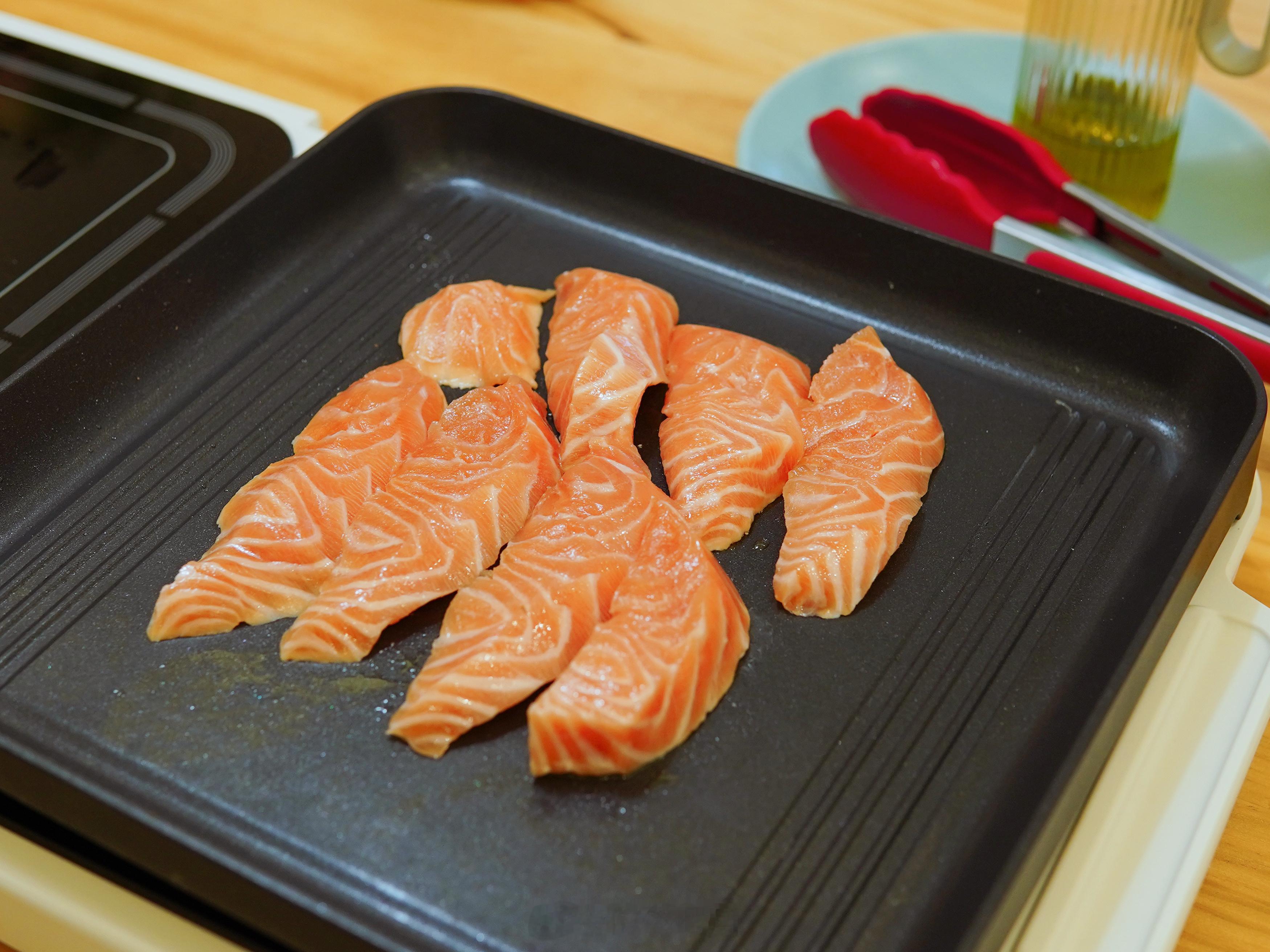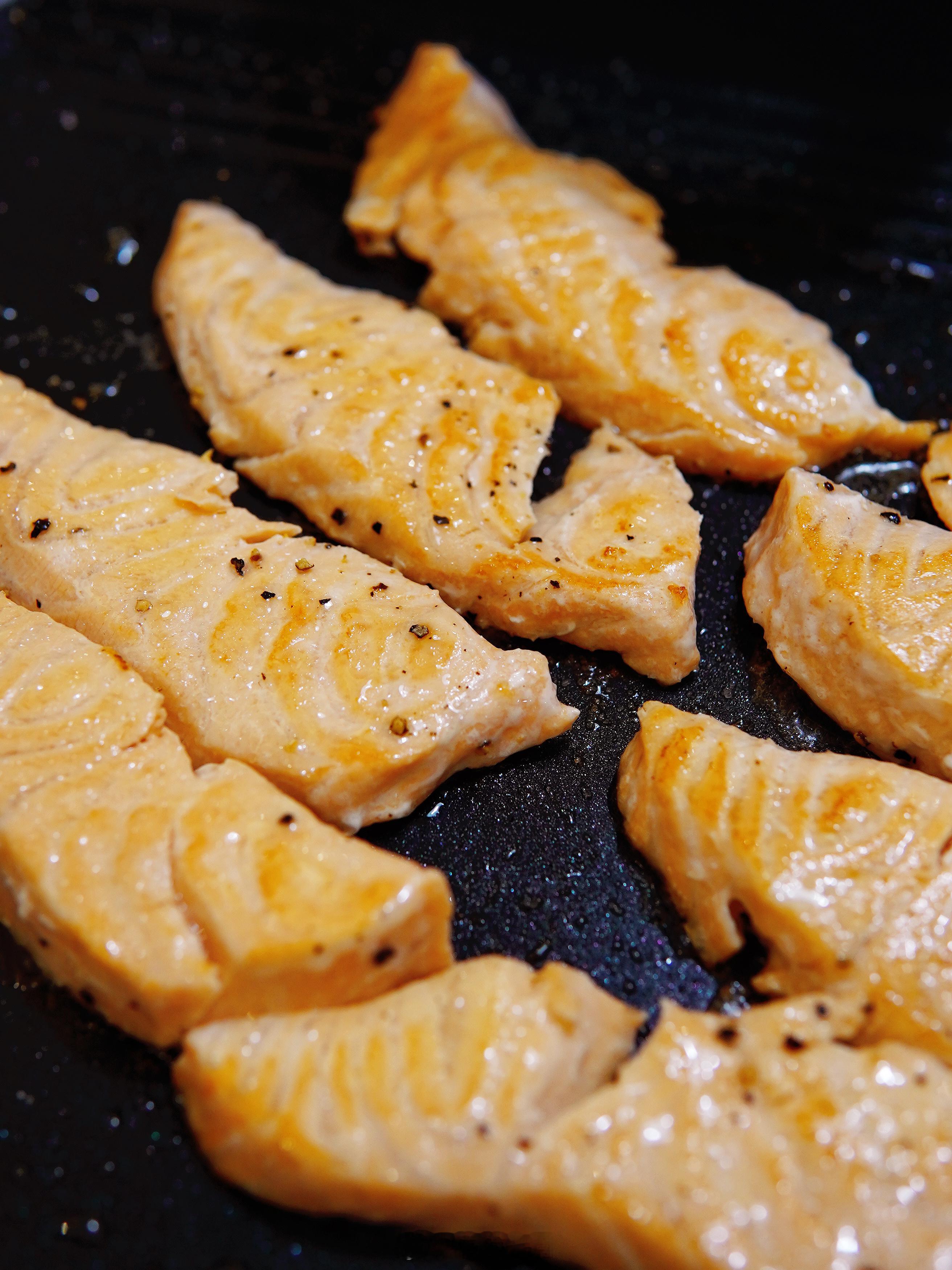 食客也挺捧场,做啥吃啥,都吃精光。这三文鱼片本来是生吃的,买回来放冰箱当天忘记吃了,怕不新鲜就煎着吃。撒点海盐和黑胡椒,微微焦黄的可香了!