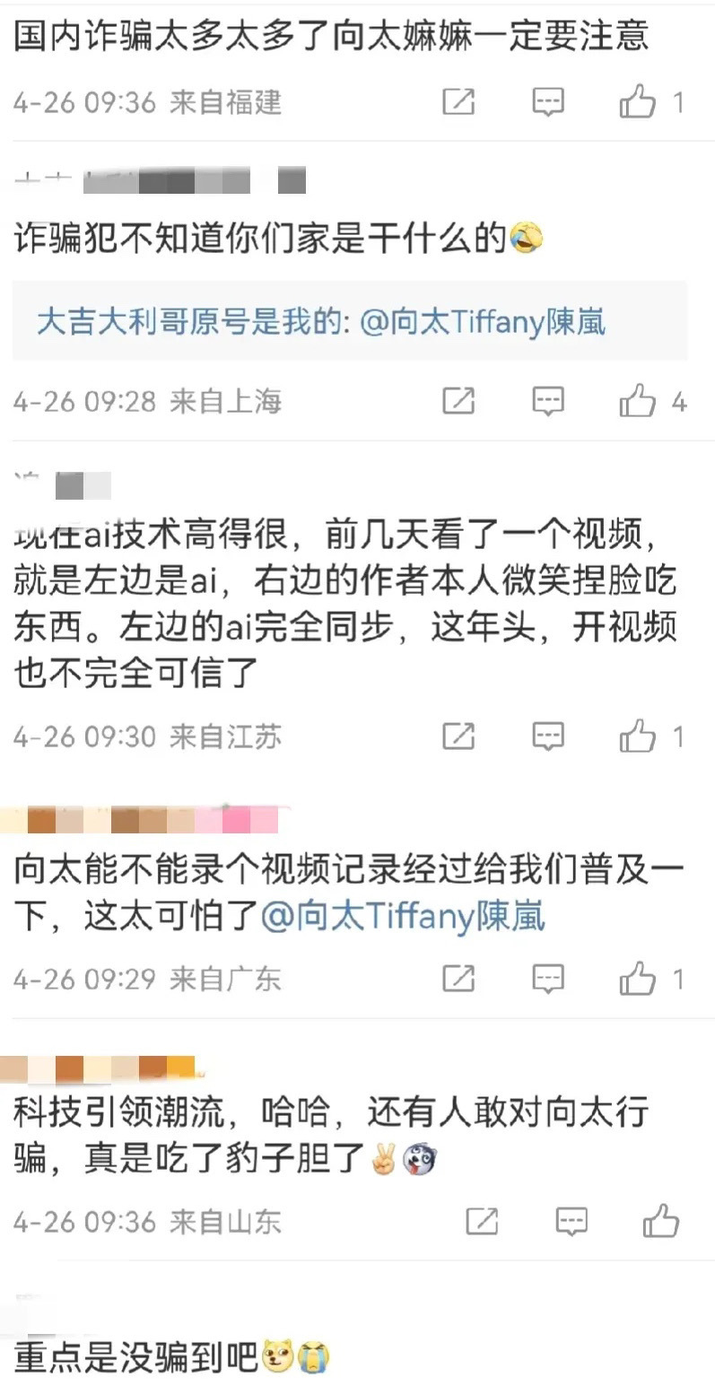 #向太没认出来向佐#4月26日,向太突然发文说自己被向佐电信诈骗了!更关键的是,她居然没有认出来,还和对方视频聊天了,最后她叮嘱大家一定要小心现在的AI换脸科技,谨防被换脸亲友诈骗。