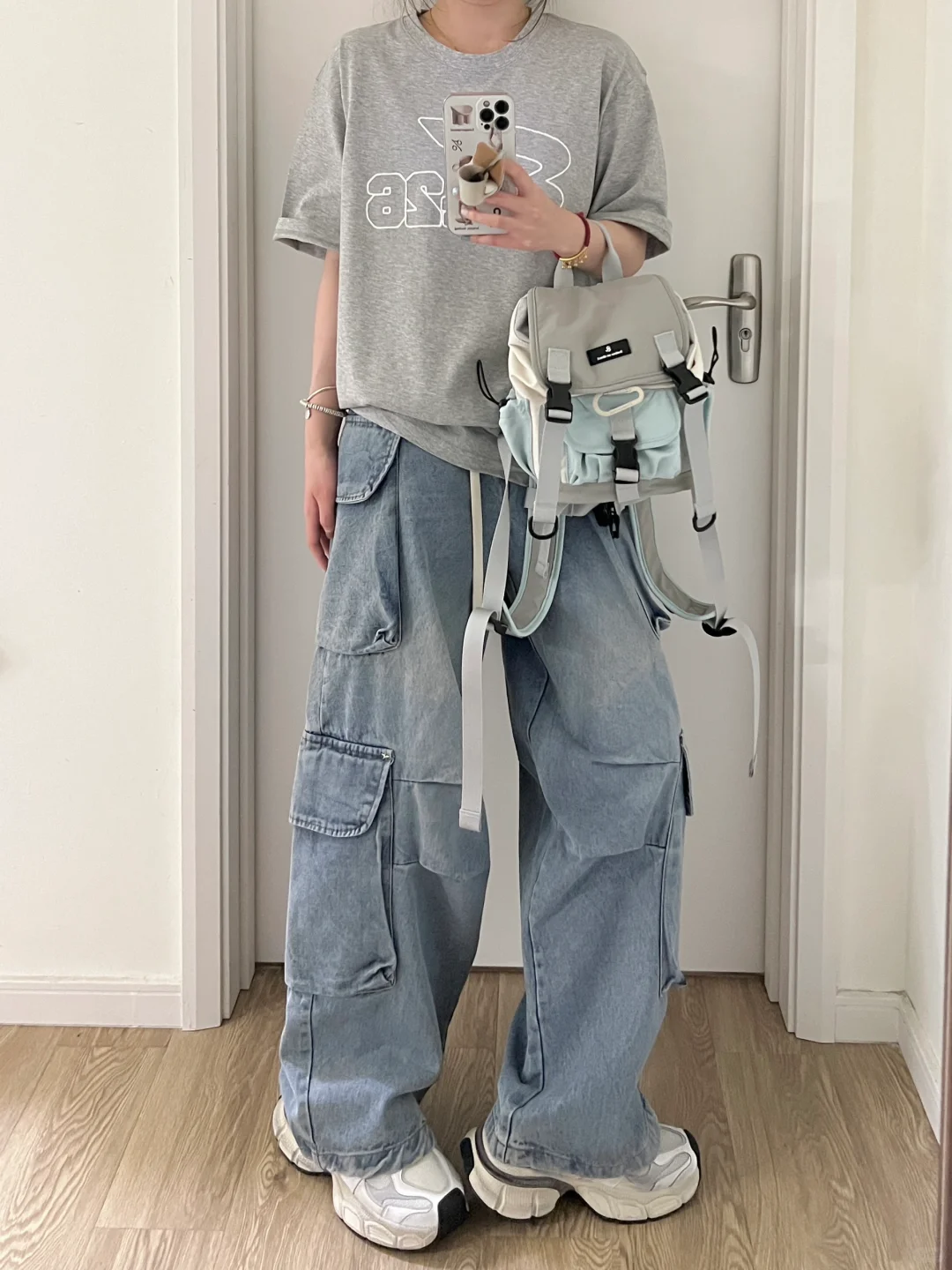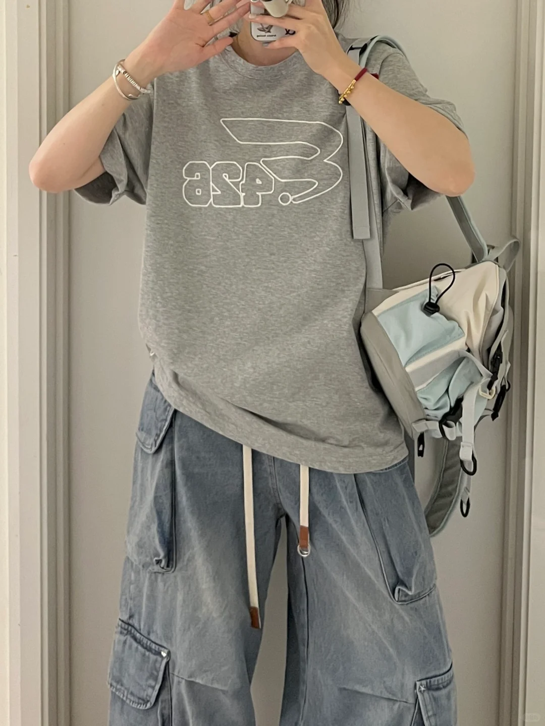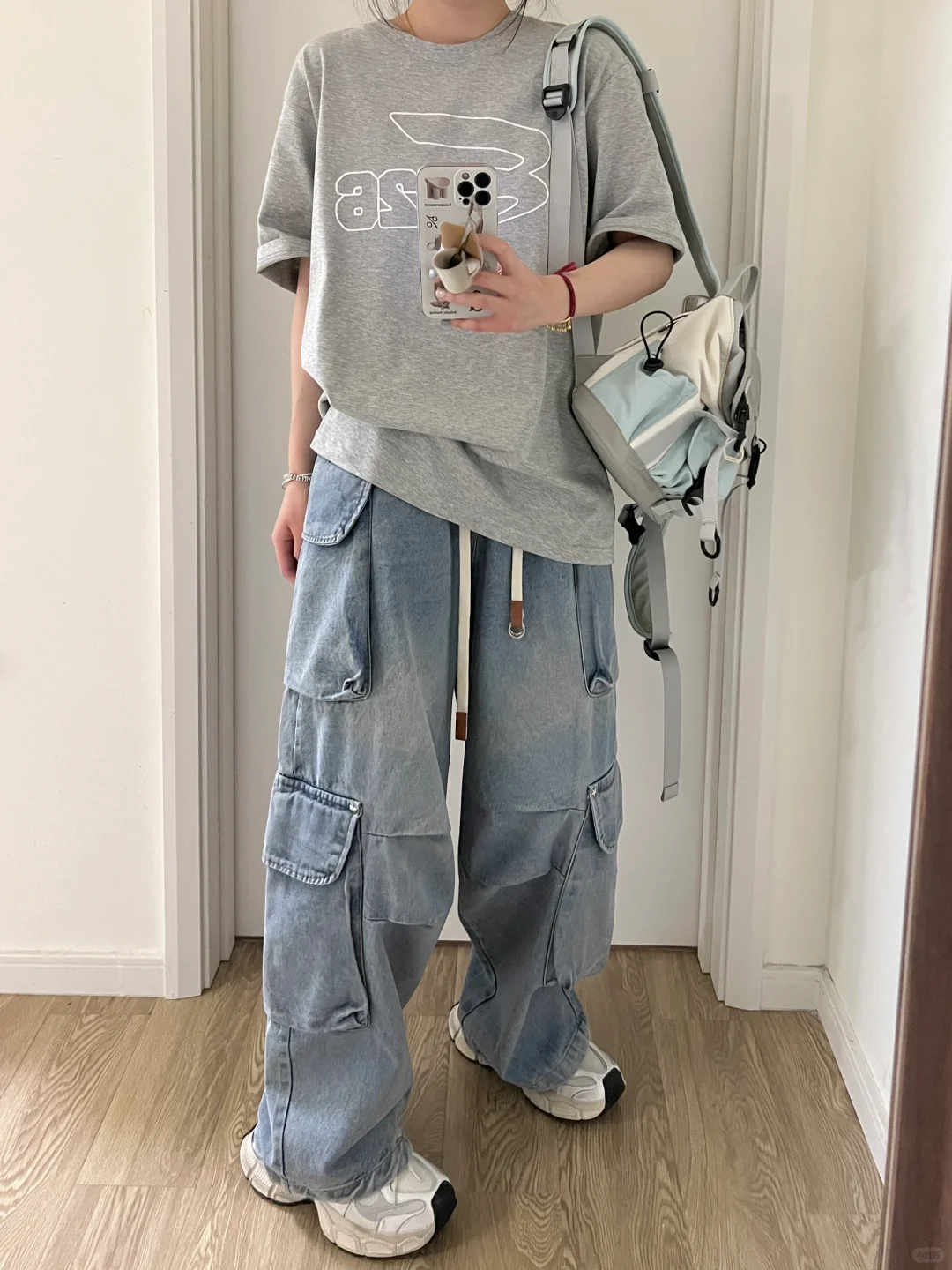 日常轻松慵懒休闲|刺绣灰T+蓝牛仔阔腿裤