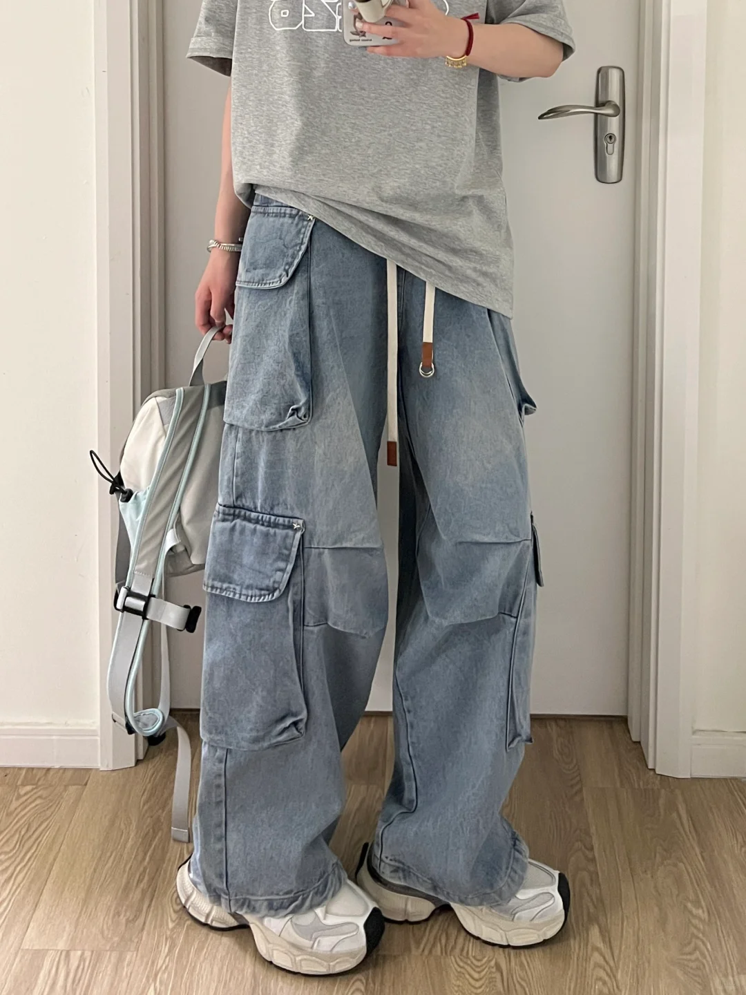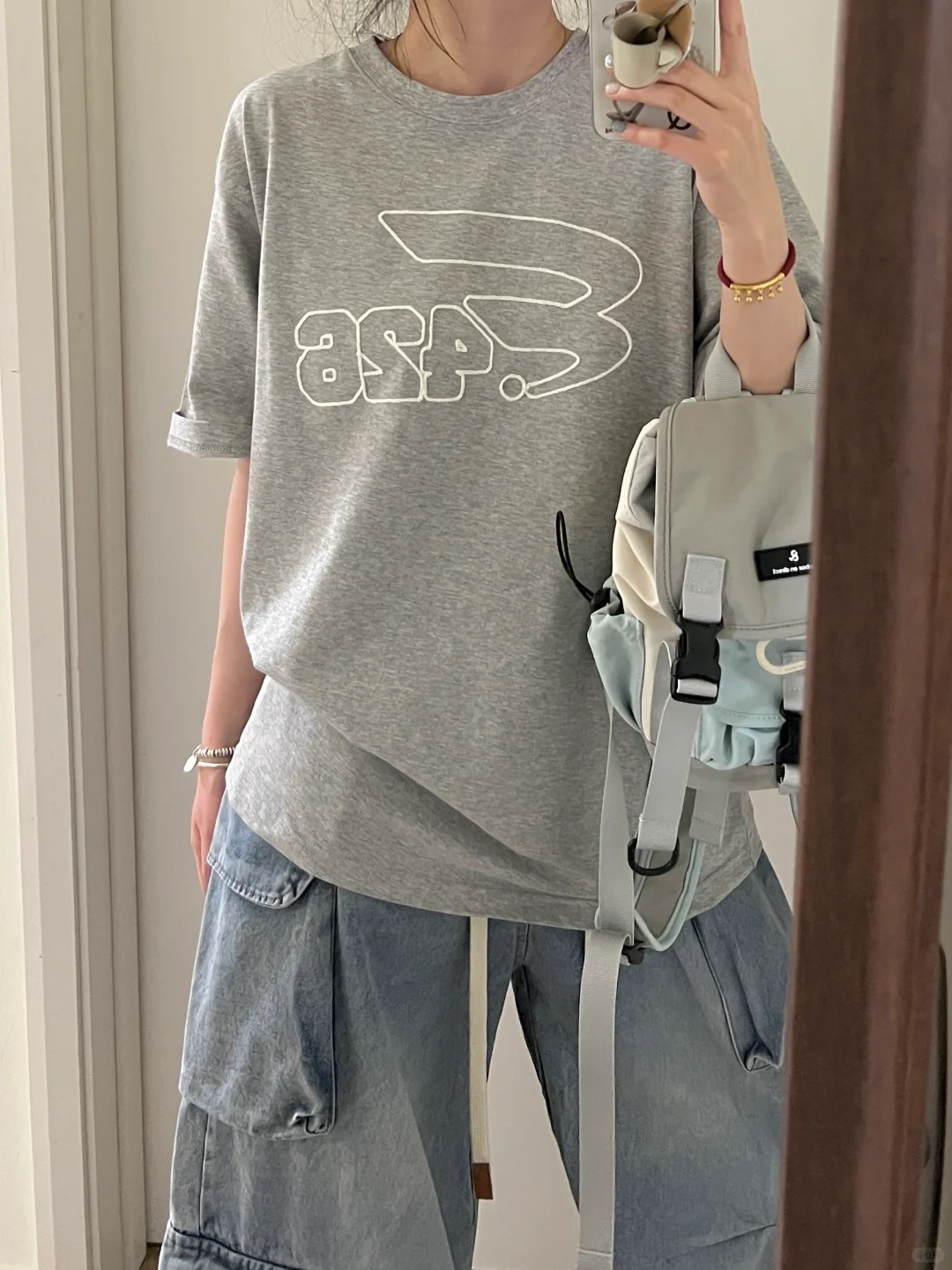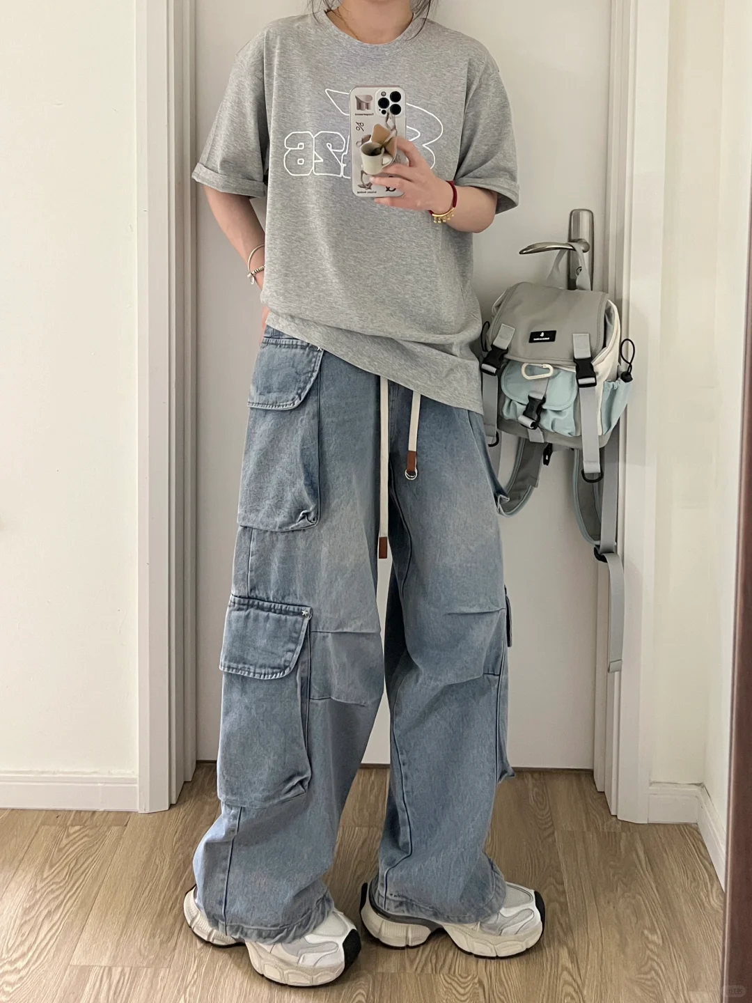 日常轻松慵懒休闲|刺绣灰T+蓝牛仔阔腿裤