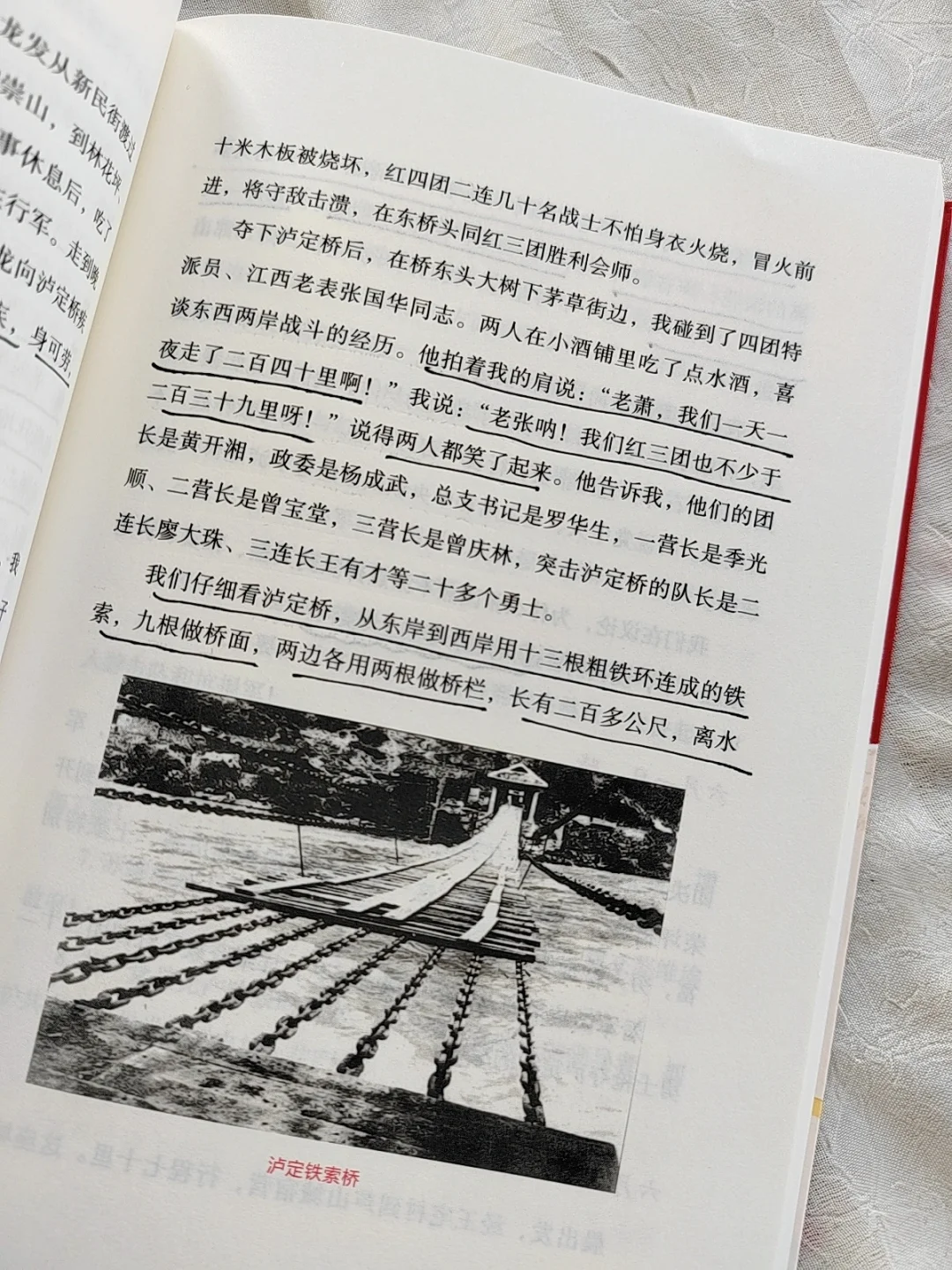 感受他们强渡大渡河,抢夺泸定桥的惊心动魄:泸定桥从东岸到西岸,用十三根粗铁环连成的铁索,九根做桥面,两边各用两根做桥栏,褐红色的流水冲击着河里的礁石,掀起丈多高的浪花,声音震耳…