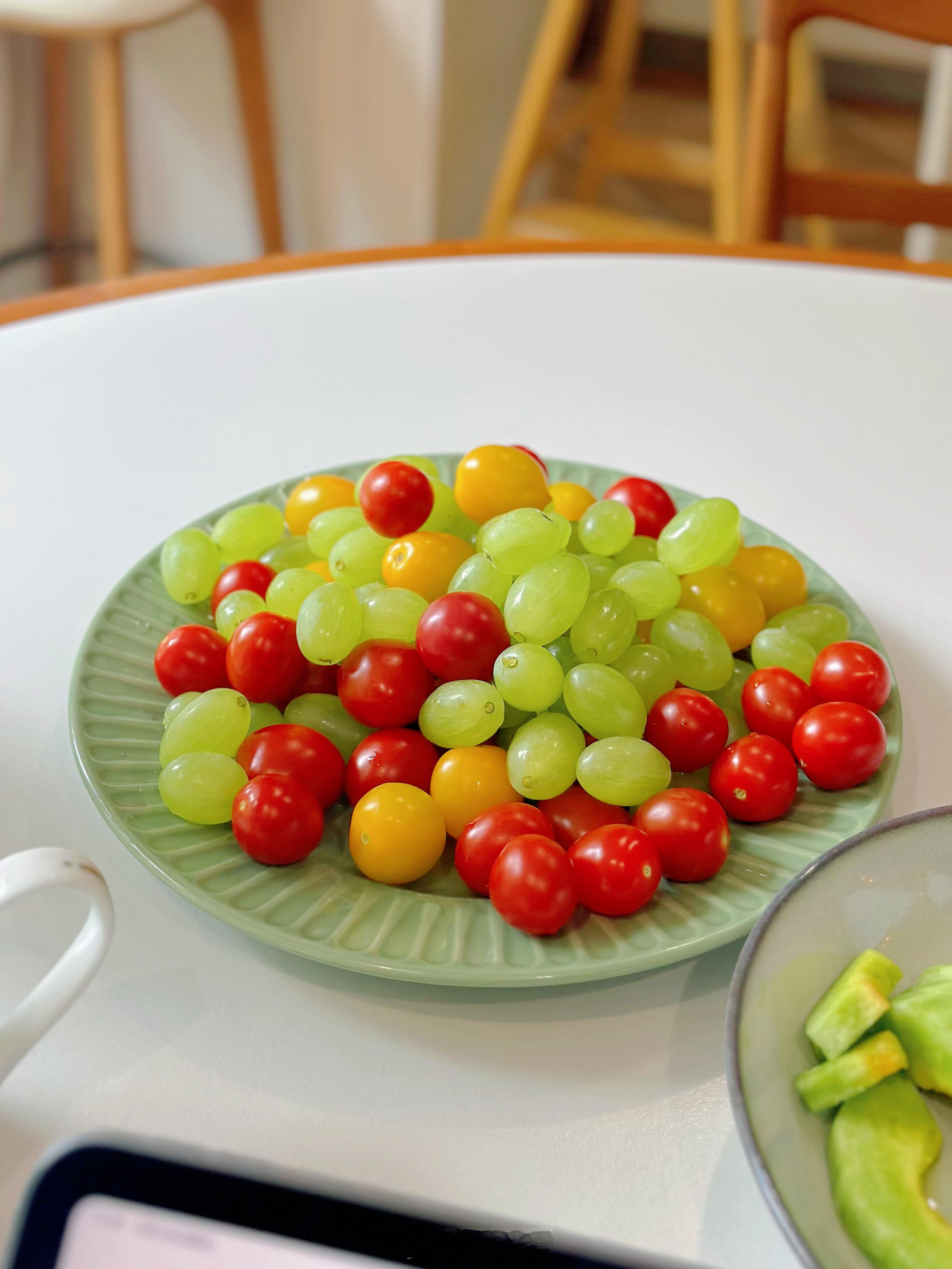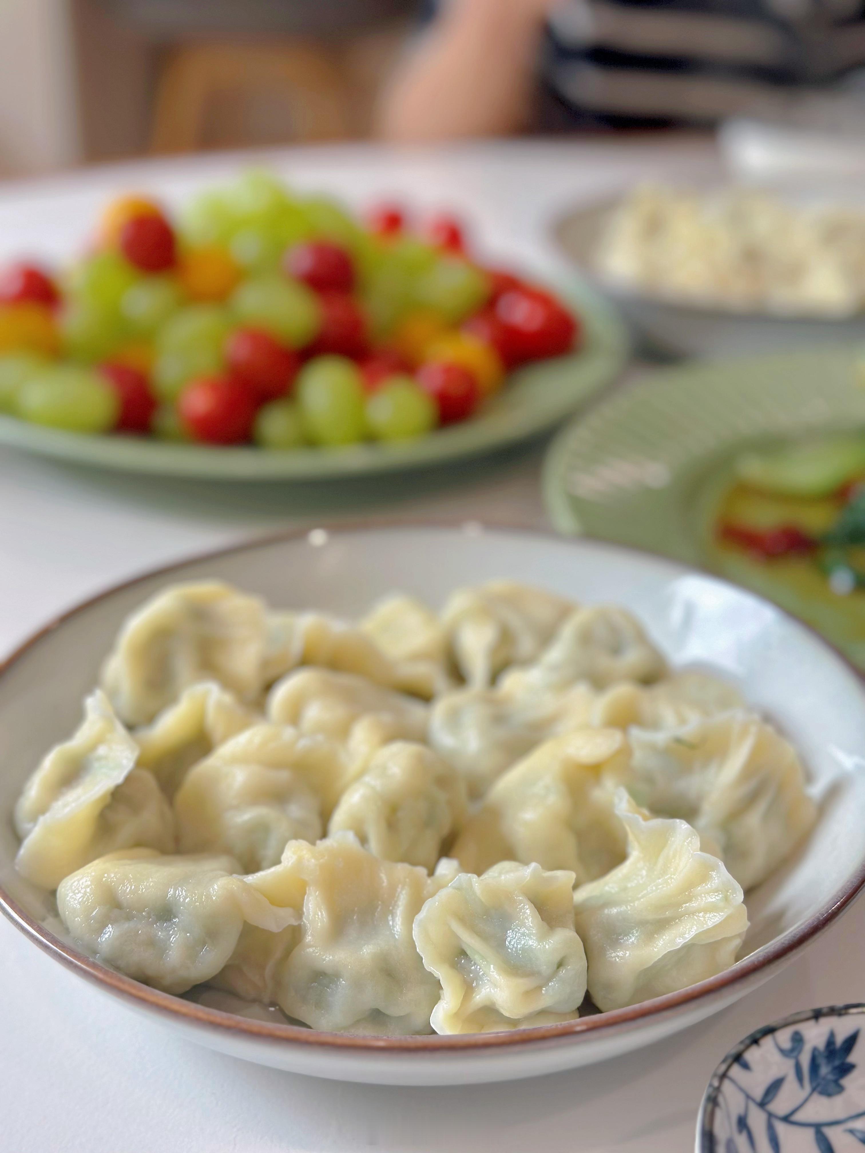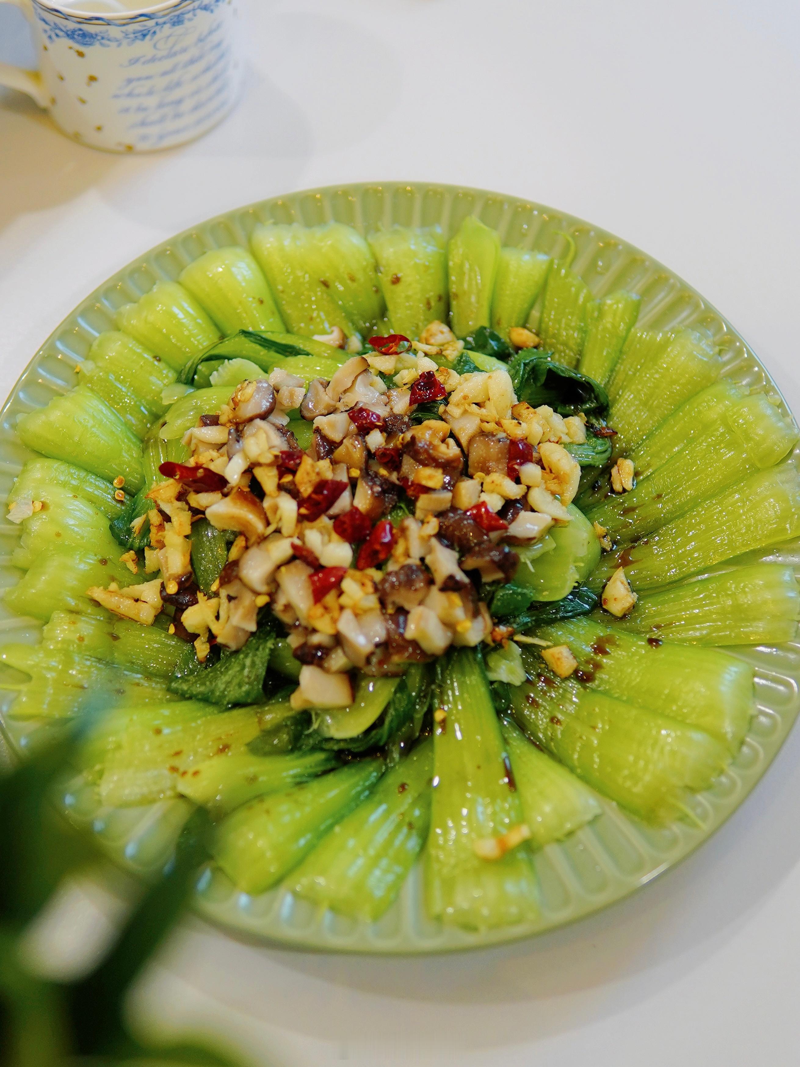 🥬她知道我爱吃菜,一早煮了有机油菜和香菇,菜是对面新开的蔬果店买的,还又一包茴香中午包饺子。又说我爱吃提子、小番茄,准备了一大盘子。用食物净化器洗干净摆在桌上。油菜精心的摆盘,喷了油,香喷喷的。打破了我16+8不吃早餐的计划。