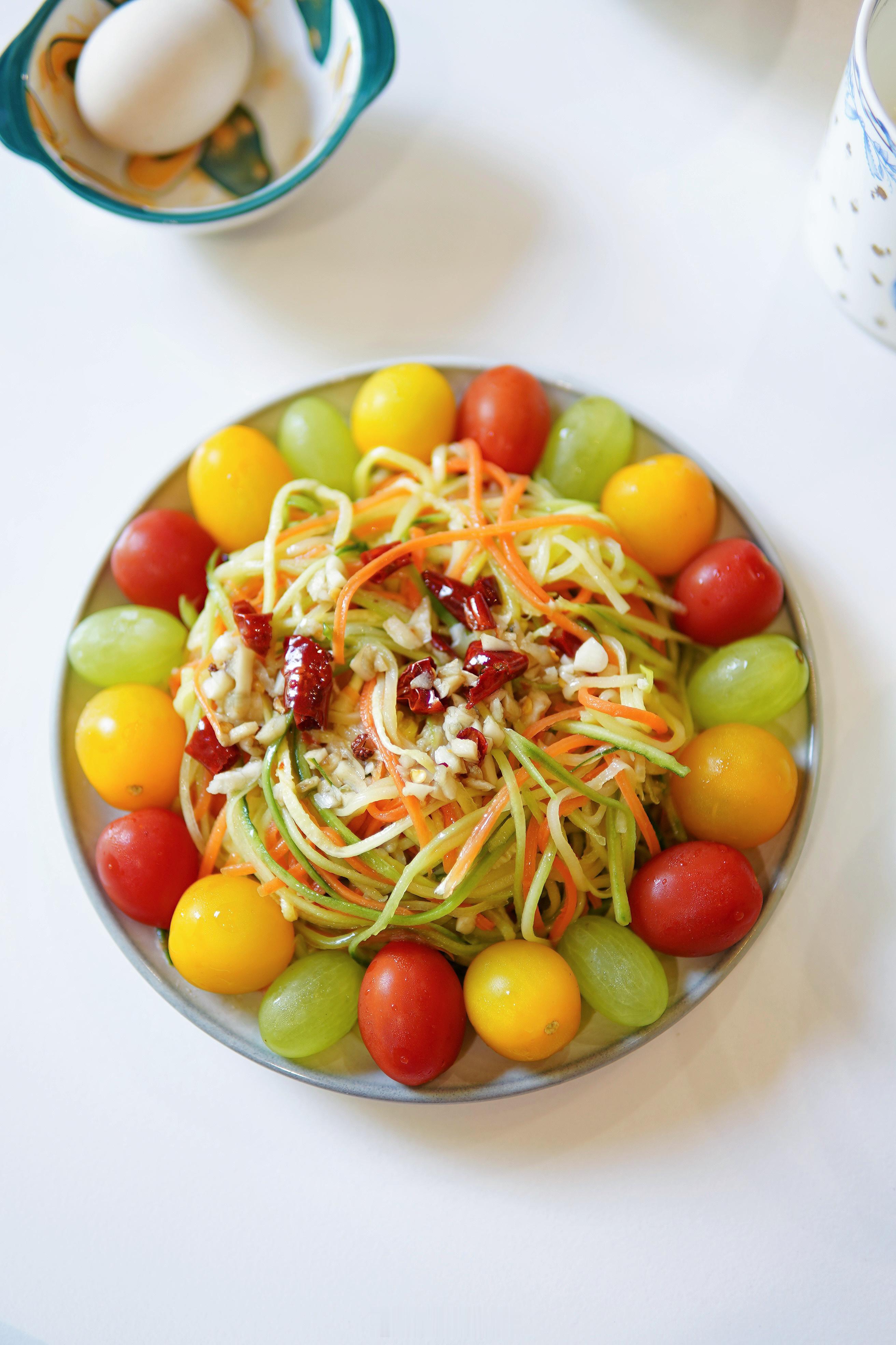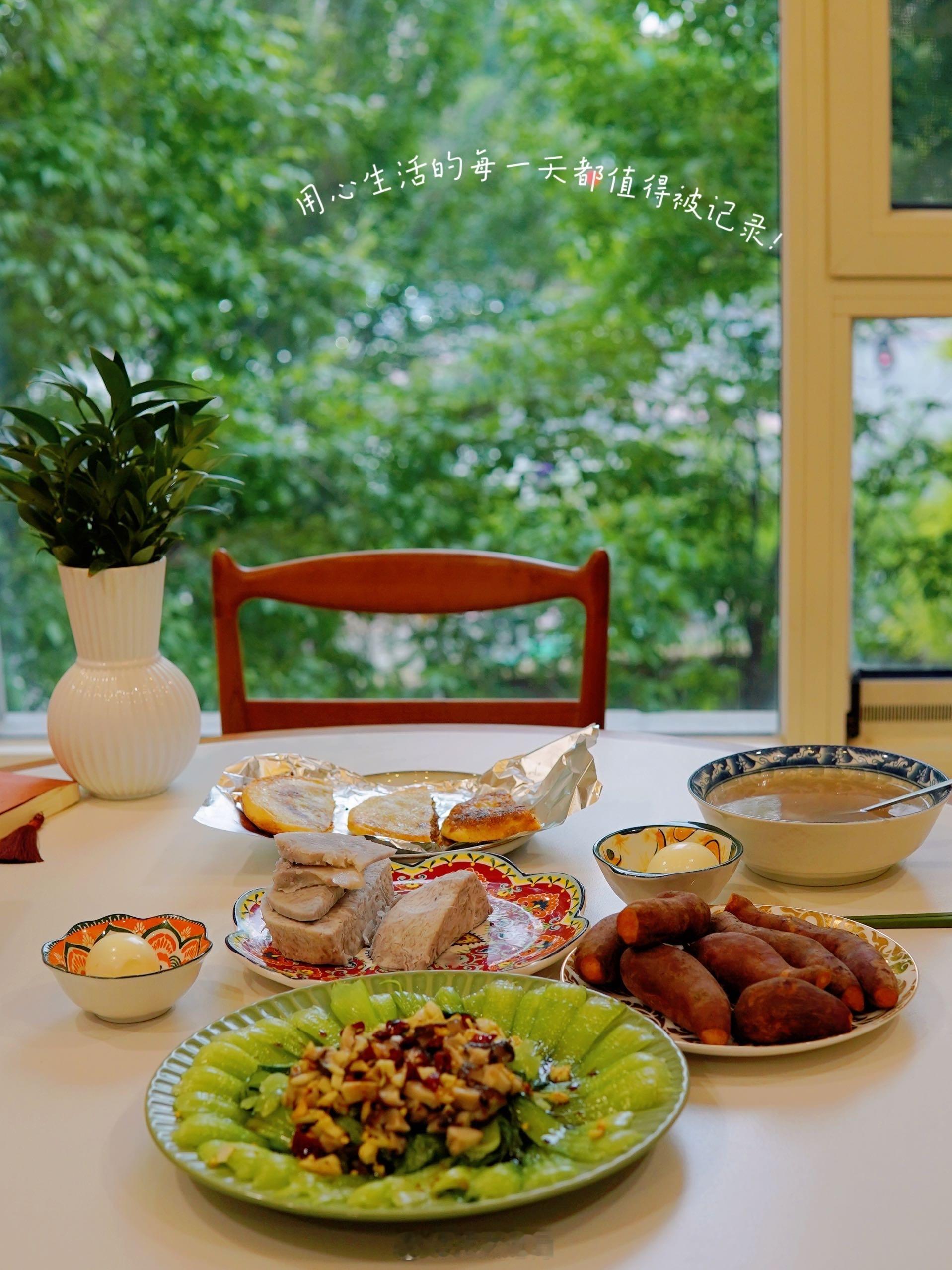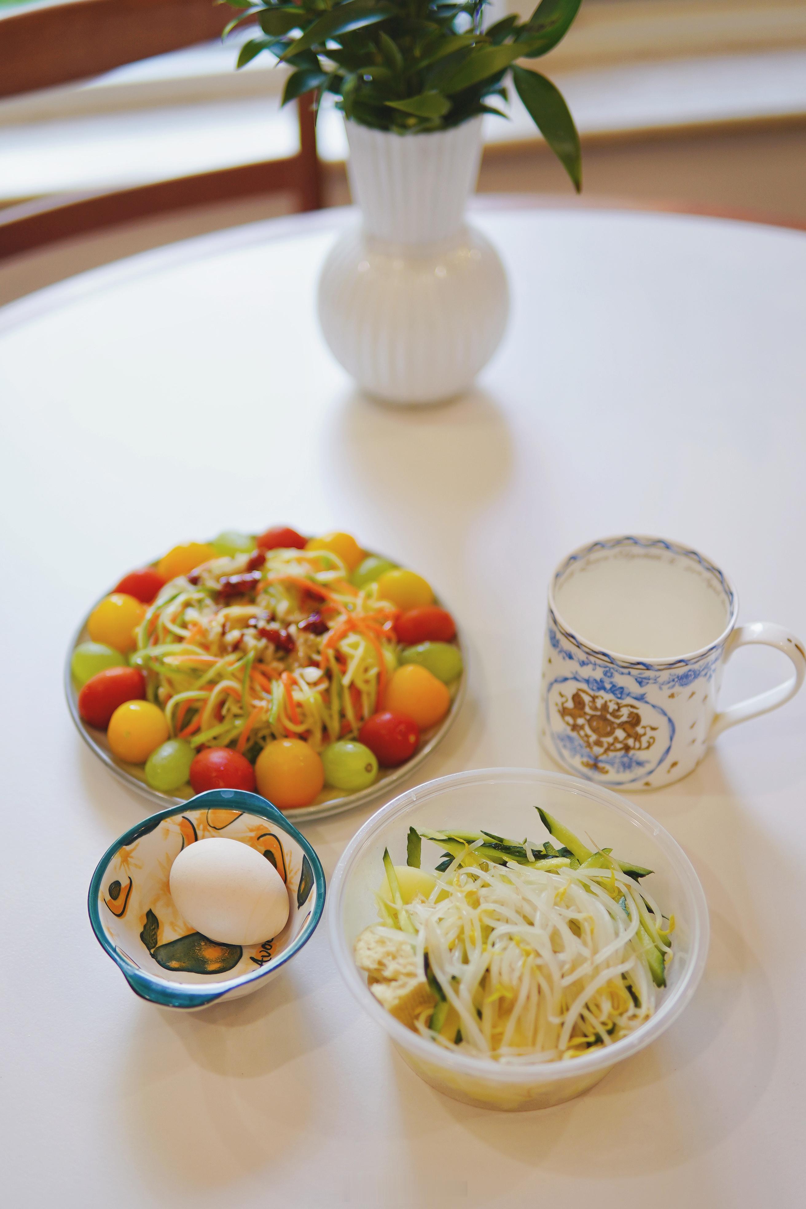 图1-3今日早餐。晨练回来婆婆给我准备的蔬菜,太感动了[苦涩],摆得多好看。我买了一份凉皮,早餐放开了吃。