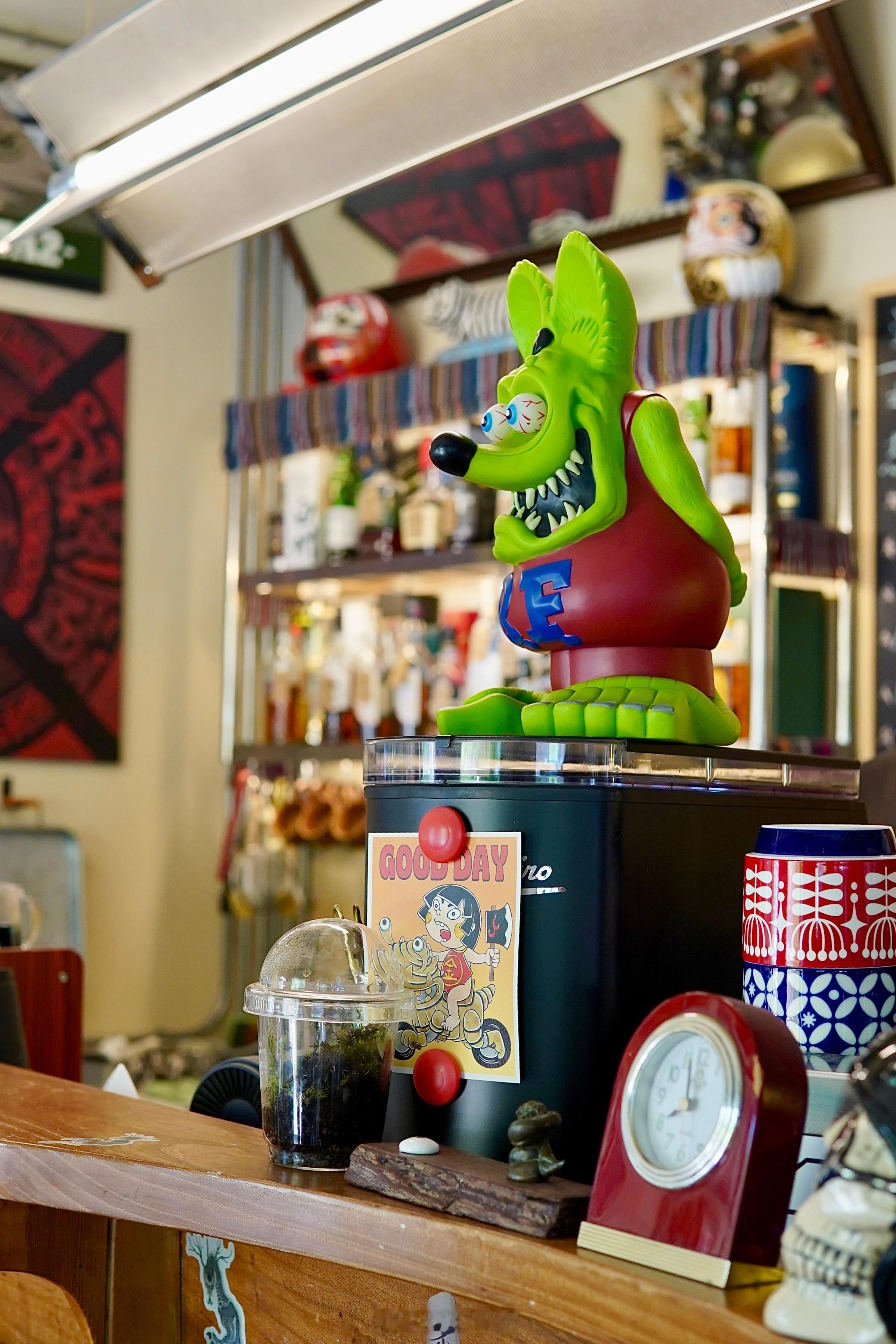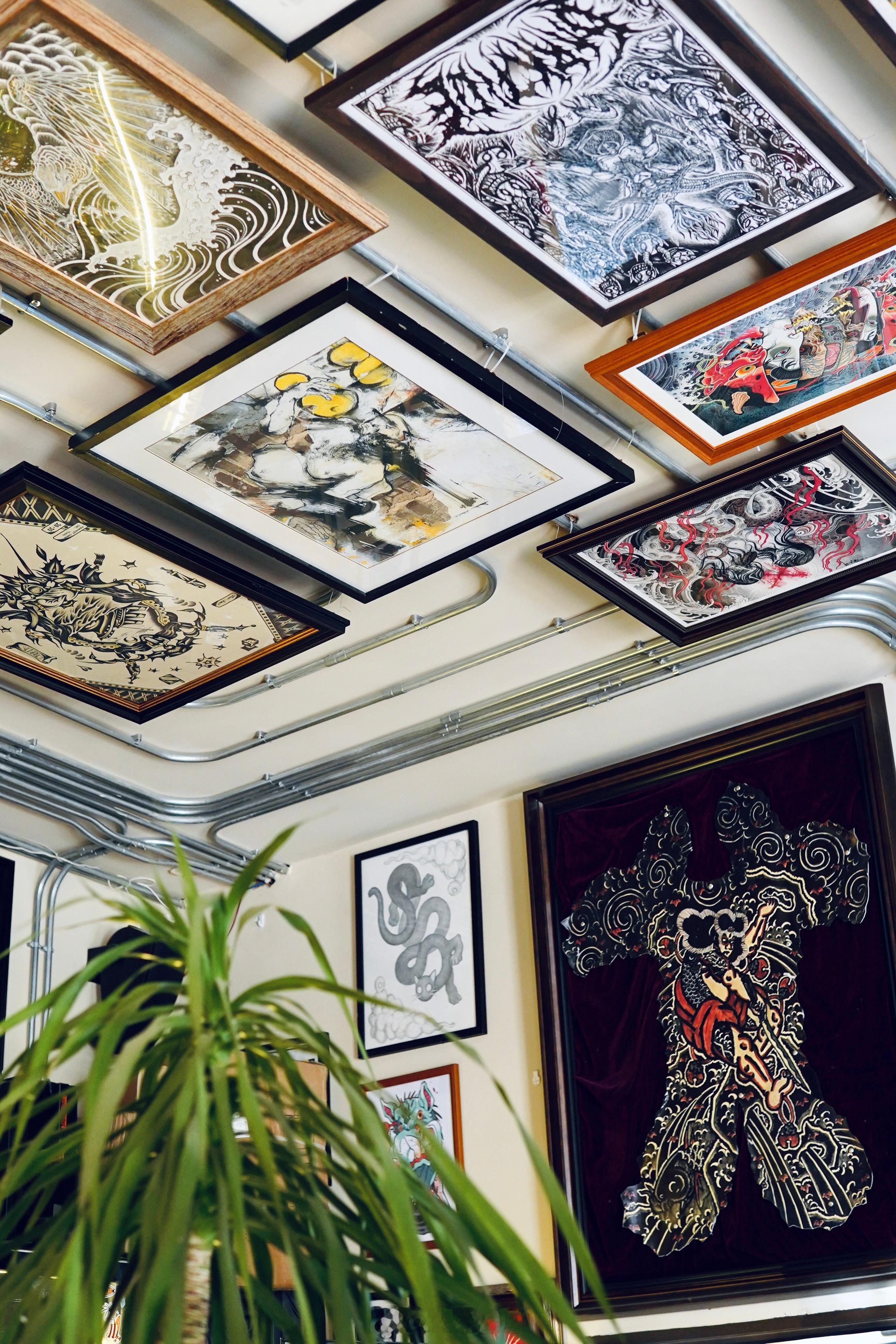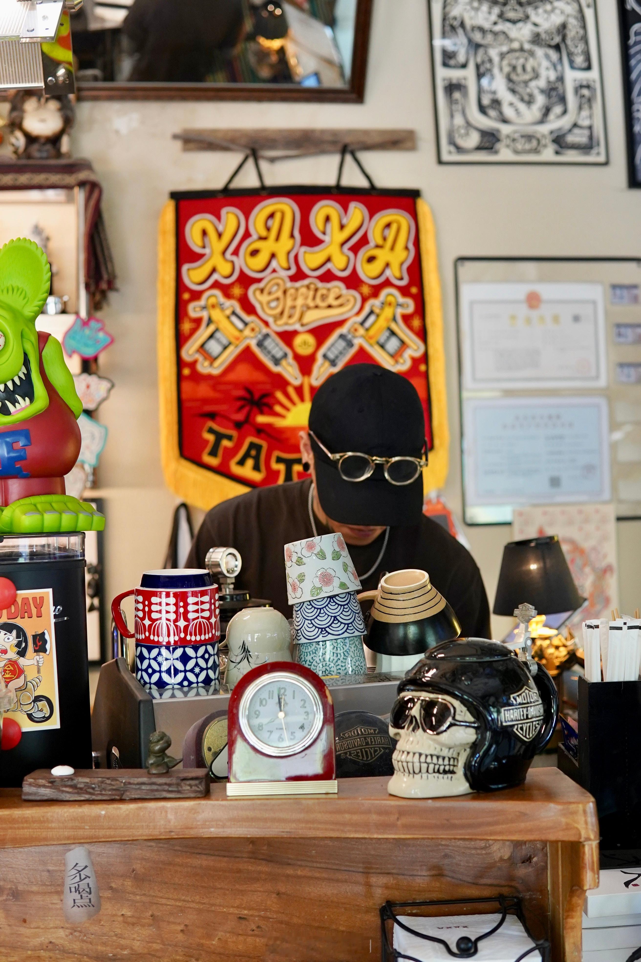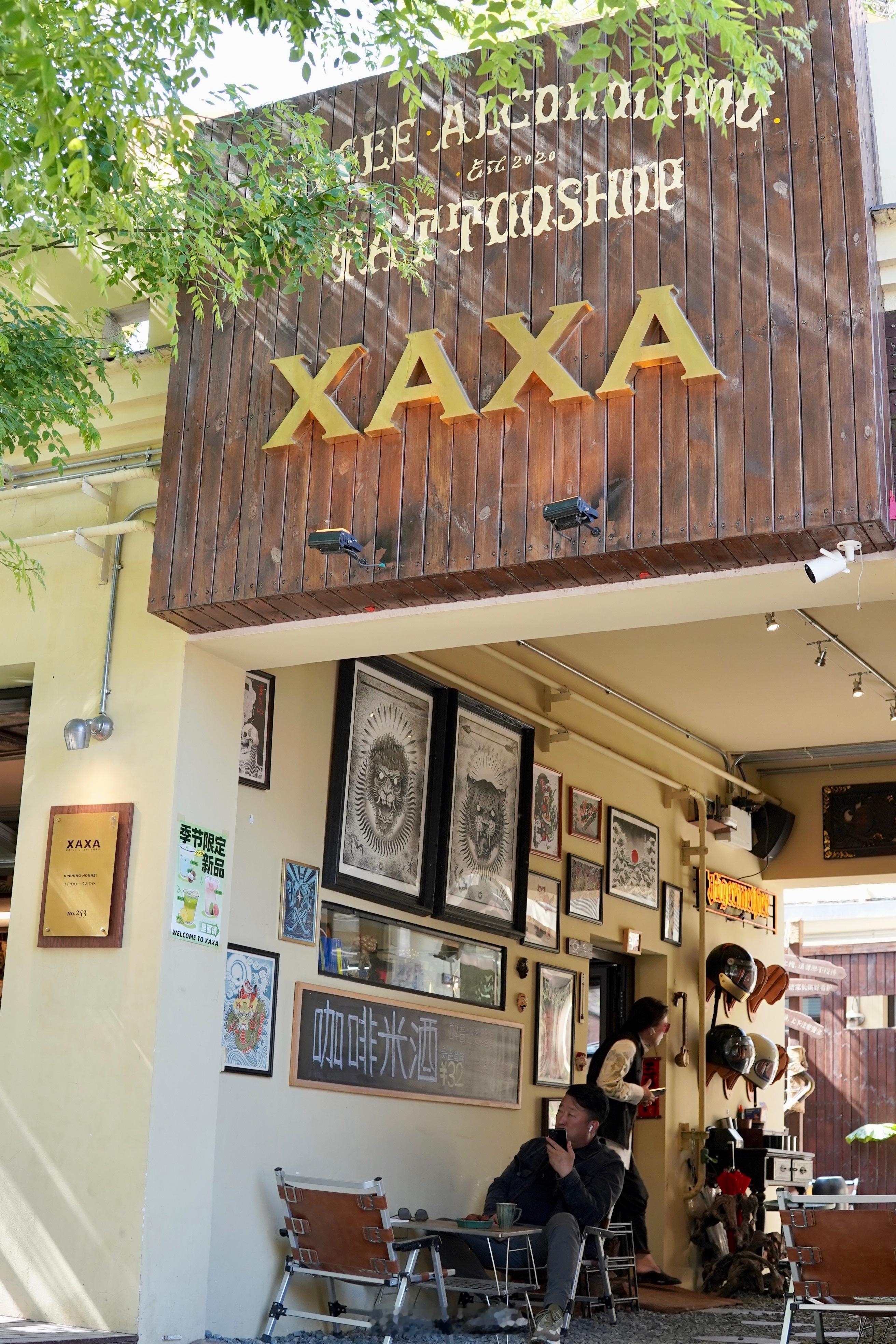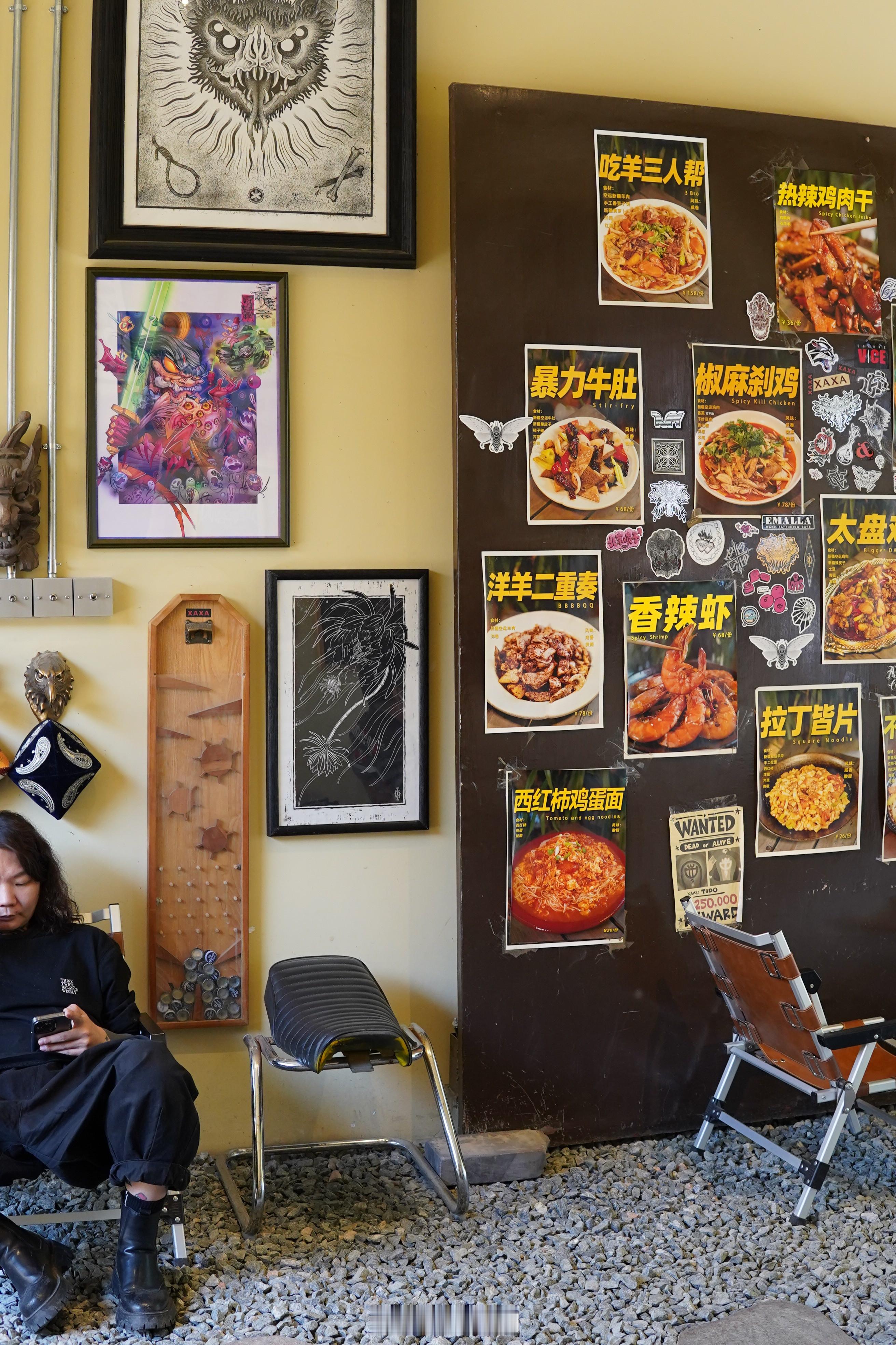 和纹身工作室开在一起的咖啡馆。它是那么的另类炫酷,屋顶都是tattoo的元素手稿。朋克酷毙了的感觉,转头又见一墙大盘鸡、牛肉粉的菜单,多巴胺瞬间提高,来这儿我不想喝咖啡只想喝啤酒。