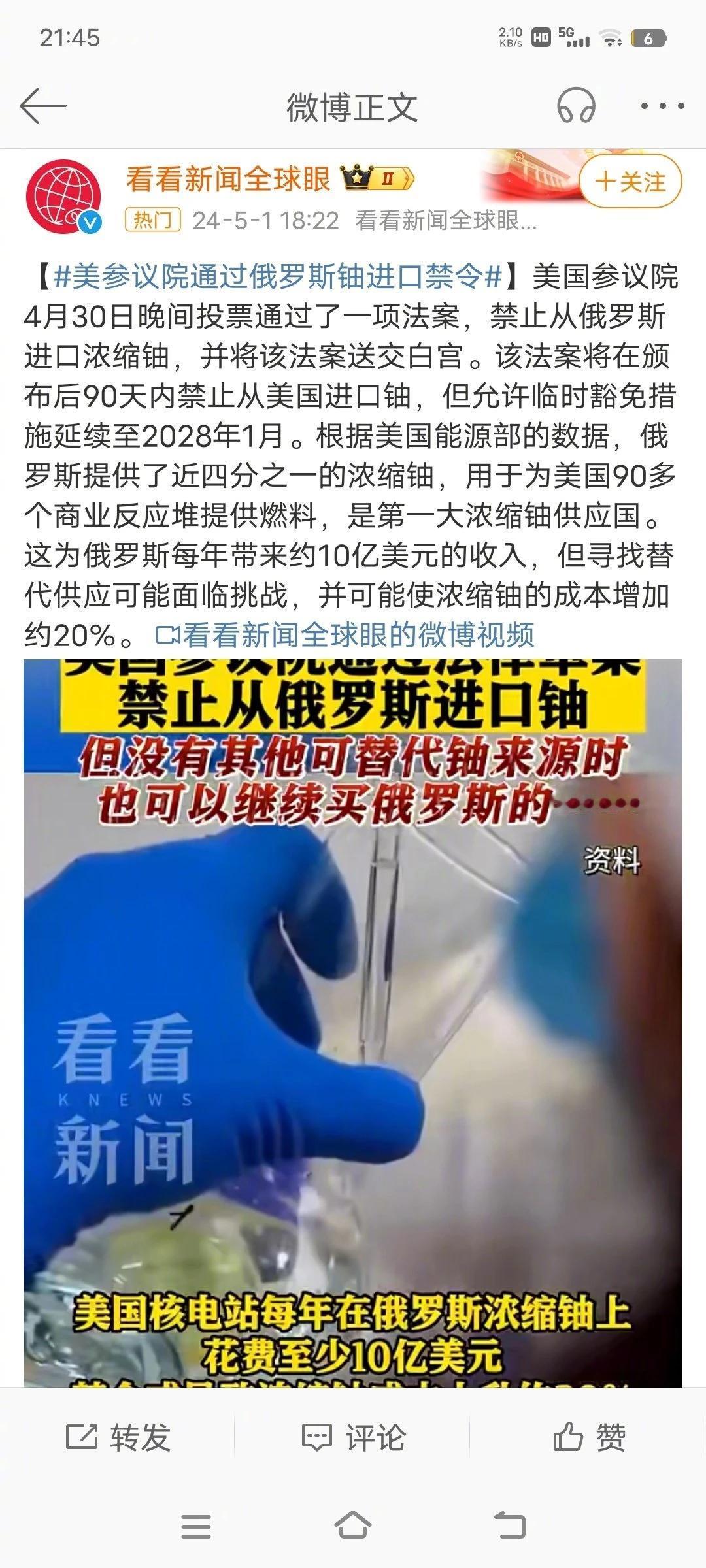 这事终于还是来了,美国禁止从俄罗斯进口浓缩铀。 【美参议院通过俄罗斯铀进口禁令】 但是临时豁免措施可延续至2028年1月。美国能源部认为俄罗斯为美国提供了近四分之一的浓缩铀,主要用于为美国90多个商业反应堆提供燃料。美国寻找替代供应可能面临挑战,并可能让浓缩铀的成本增加约20%。 如果切断俄罗斯对美国浓缩铀燃料的供应,那么美国核电站核燃料供应体系带来较大困境,需要调整好几年才能喘过气来。 俄罗斯是世界第一大浓缩铀供应国,出口美国的浓缩铀每年可为俄罗斯带来超过10亿美元的收入。欧盟也有大约有20%的浓缩铀依赖于俄罗斯。俄罗斯一直垄断着全世界发电用低丰度浓缩铀核燃料市场42%的份额,其中俄罗斯国有原子能公司浓缩铀的供应量就占到全球市场份额的35%。 美国有25%的核电浓缩铀燃料从俄罗斯进口,美国甚至还从俄罗斯买过500吨丰度97%的可以直接做核弹的武器级浓缩铀(显然是从苏联核弹头上拆下来的),而核电站燃料的浓缩铀丰度只有3%就够了。 不过,美国禁止进口俄罗斯浓缩铀是一把“双刃剑”,俄罗斯自己的浓缩铀收入会大幅缩减,但美国寻找稳定的替代来源也不容易,而且需要接受价格上涨。 好在,拜冷战所赐,全世界浓缩铀的产能是过剩的。 美国自己的浓缩铀产能就非常强大,只是在俄罗斯低价浓缩铀的挤兑下,美国本土浓缩铀产业关闭了很多。只有当受到强烈市场刺激的时候,美国本土浓缩铀产业才会爆发。 #欧盟拟将乌适龄男性送回 俄方回应#