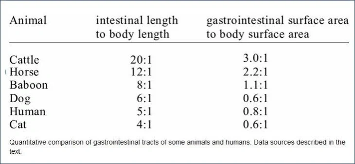 -猫的肠道很短:食草动物的往往拥有非常长的肠道,原因是消化高纤维素食物所需要的时间比肉类多得多,一般食草动物的肠道/身长比值也都在10倍左右,这远远高于食肉动物。食肉动物每天吃的东西相对来说好消化得多,猫的肠道/身长比值只有4,比人和狗都短。