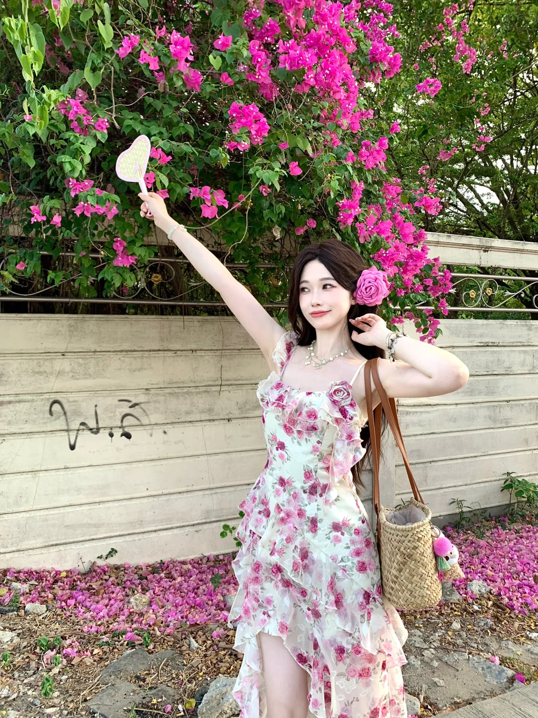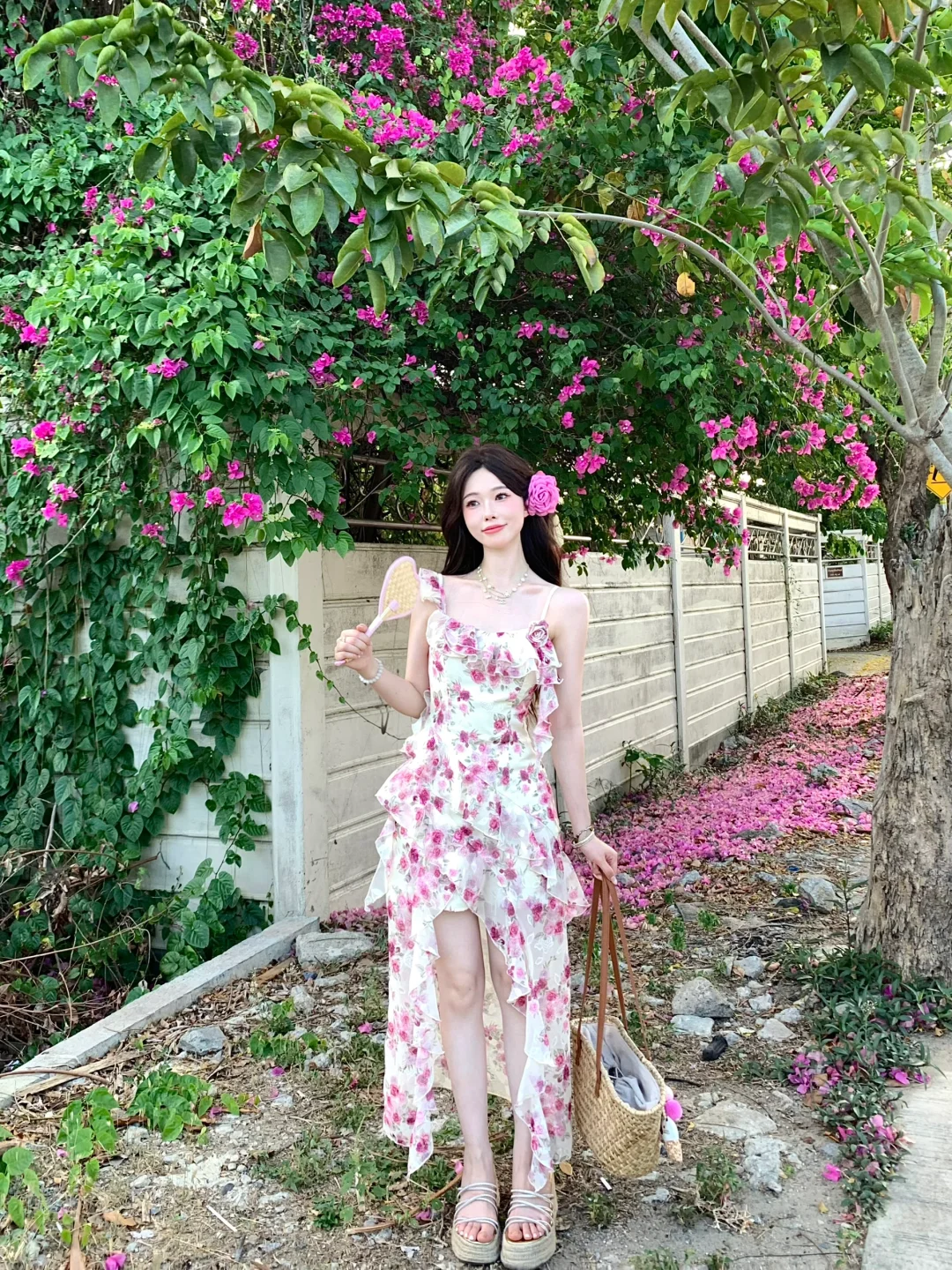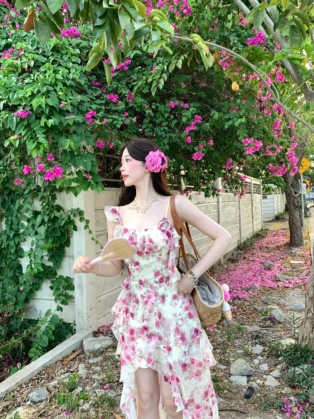 碎花裙搭配 度假穿什么 氛围感穿搭 三角梅随拍 不规则裙摆