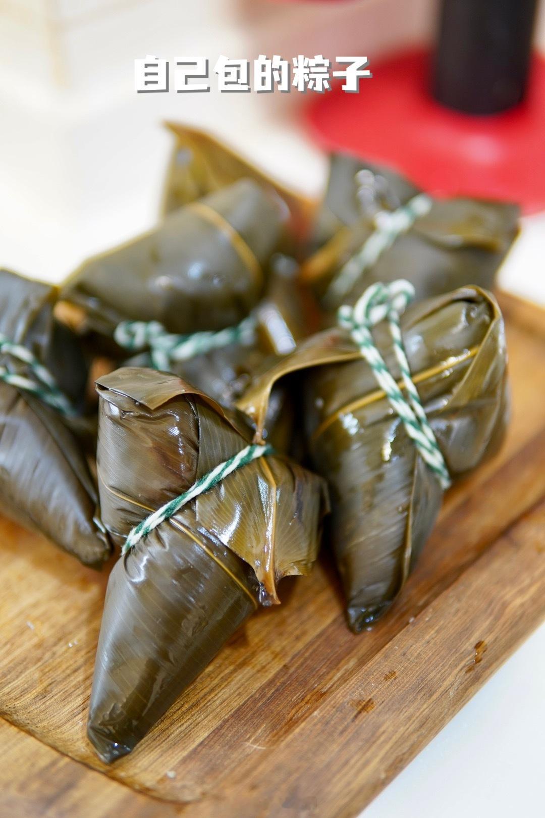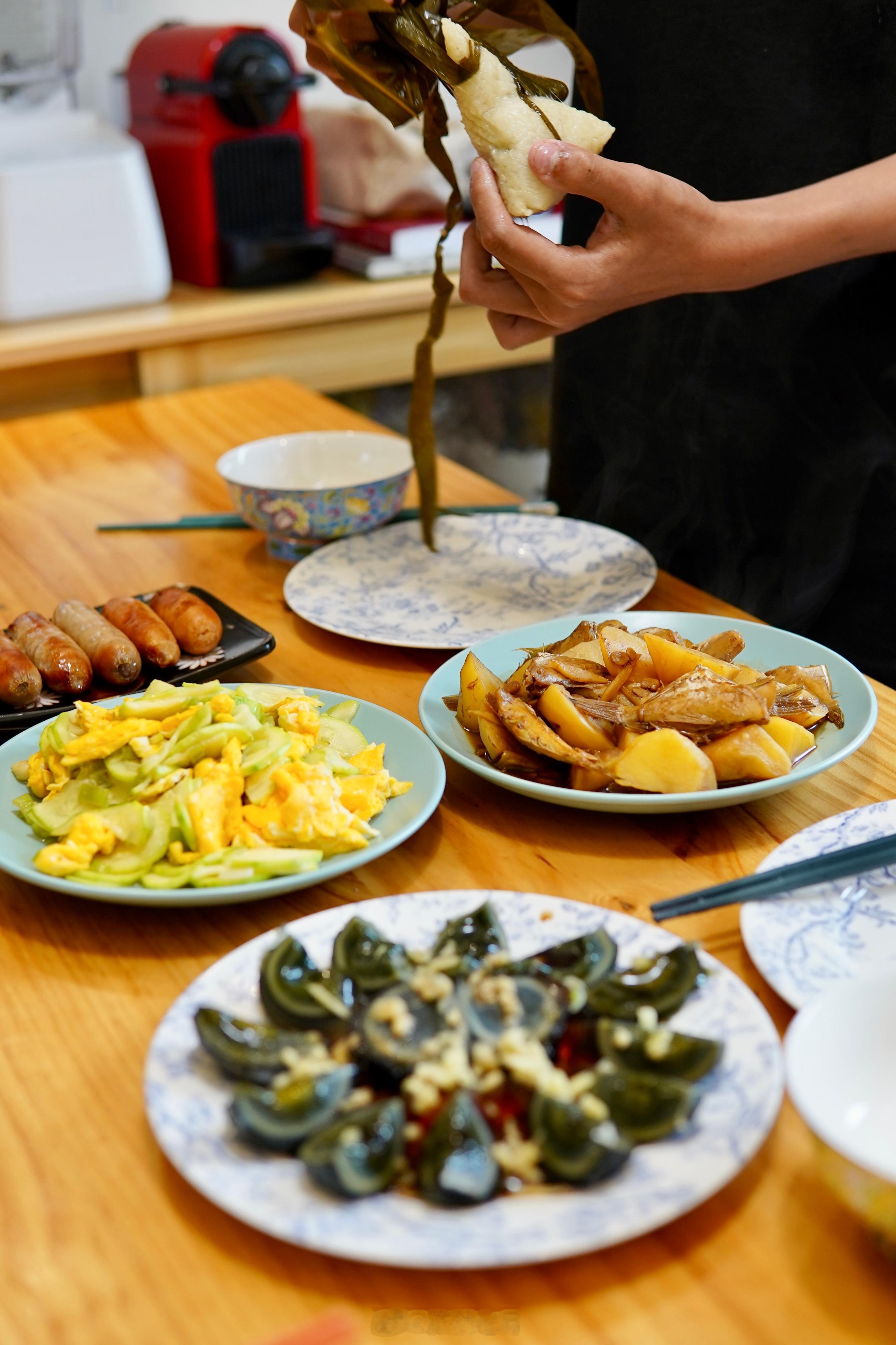 姜汁皮蛋,西葫芦炒鸡蛋随手搞定。我妈给外孙儿包的大粽子,粽子叶裹得紧紧实实的。里面一颗大红枣儿煮的软烂,软糯香甜,好吃极了。