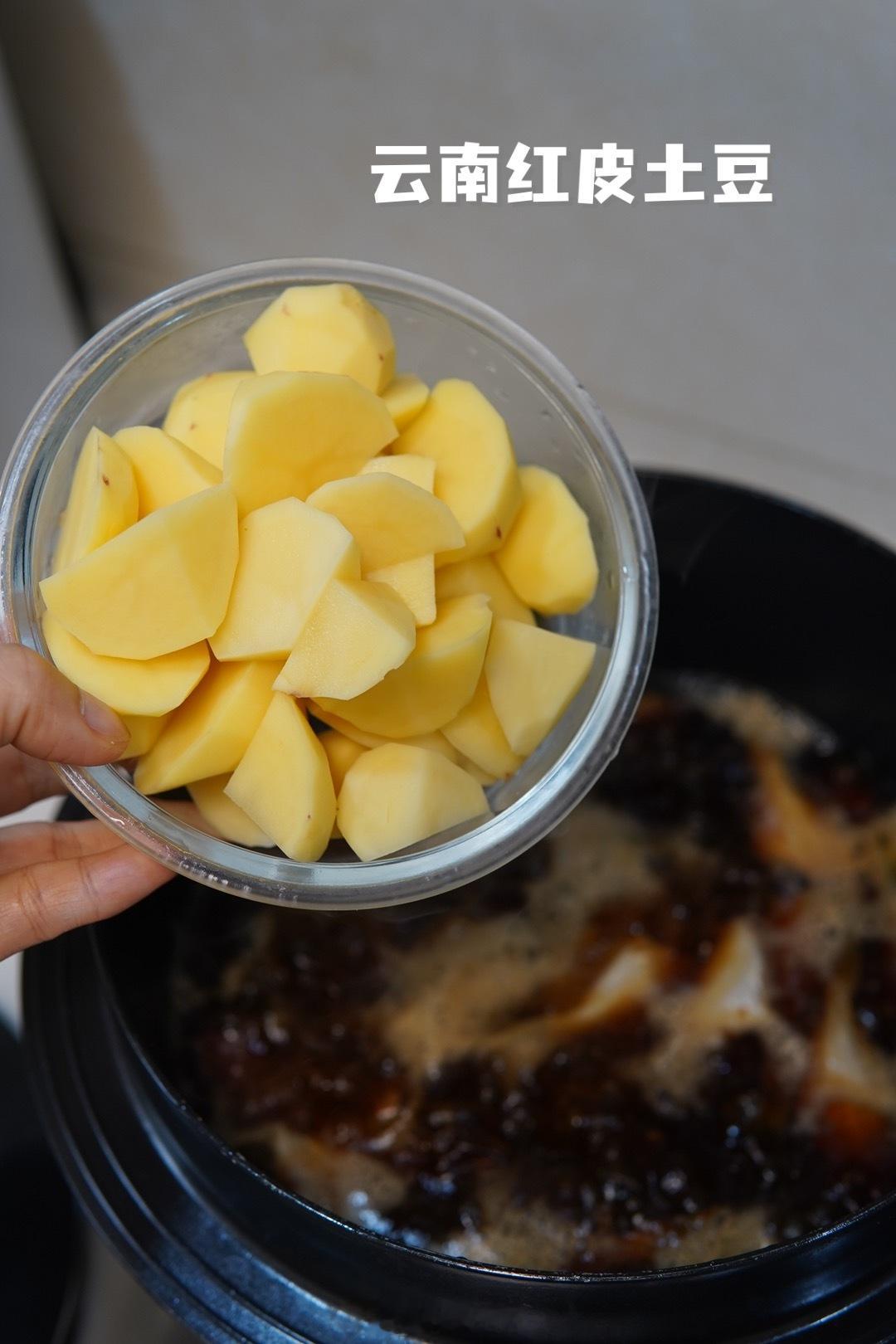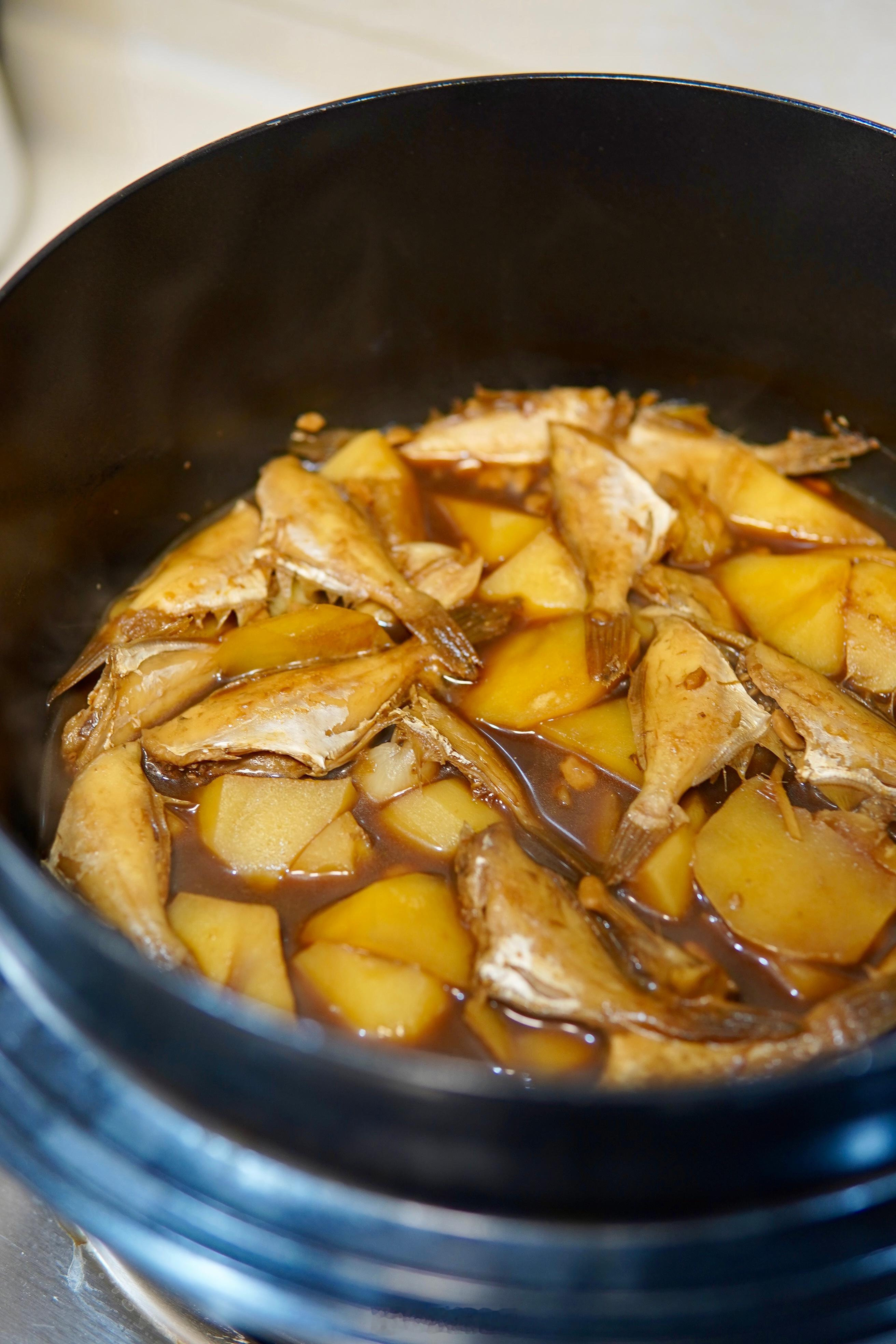 家常小菜有滋有味儿的。冰箱里翻出来一袋儿剥皮鱼,都处理干净了,解冻之后用姜丝儿垫底儿。放生抽、老抽、黄豆酱,加云南红皮黄心土豆来个酱焖。