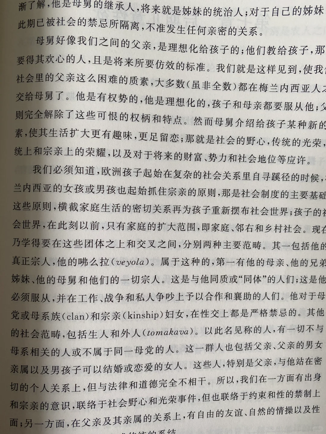 父亲不会走到家庭生活的亲密地步,他住旁边的茅屋甚至村庄,母舅才拥有权利