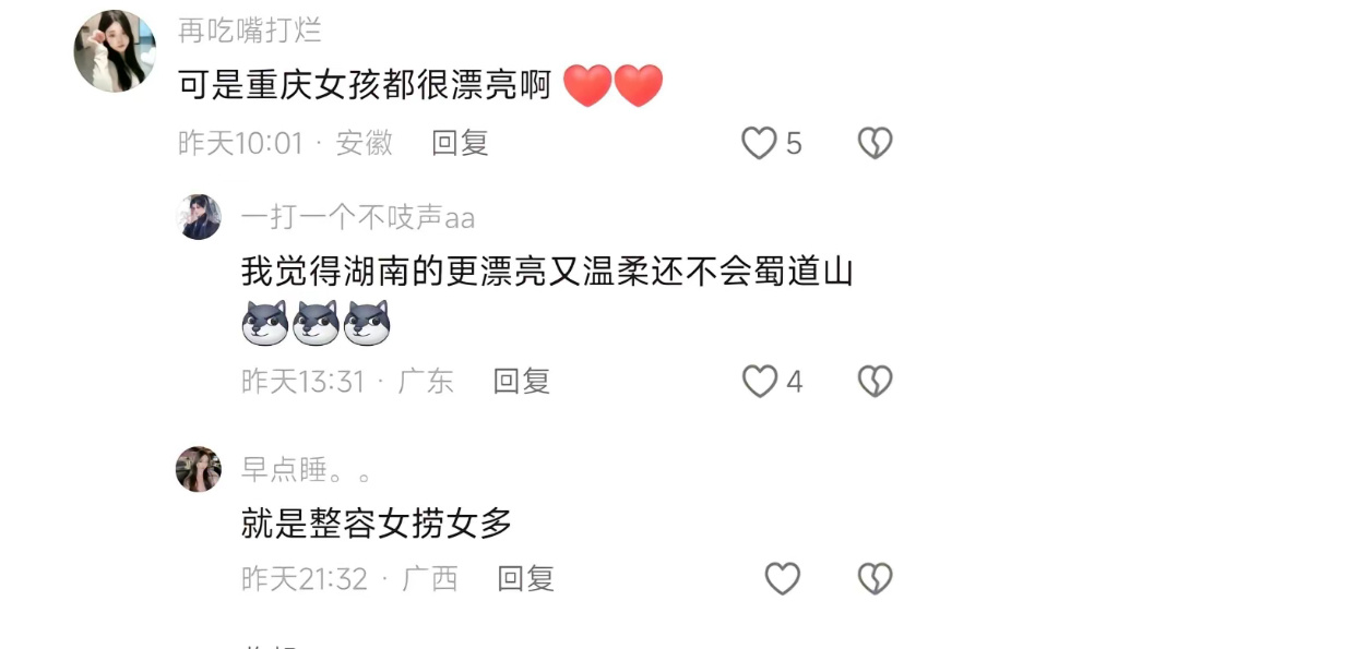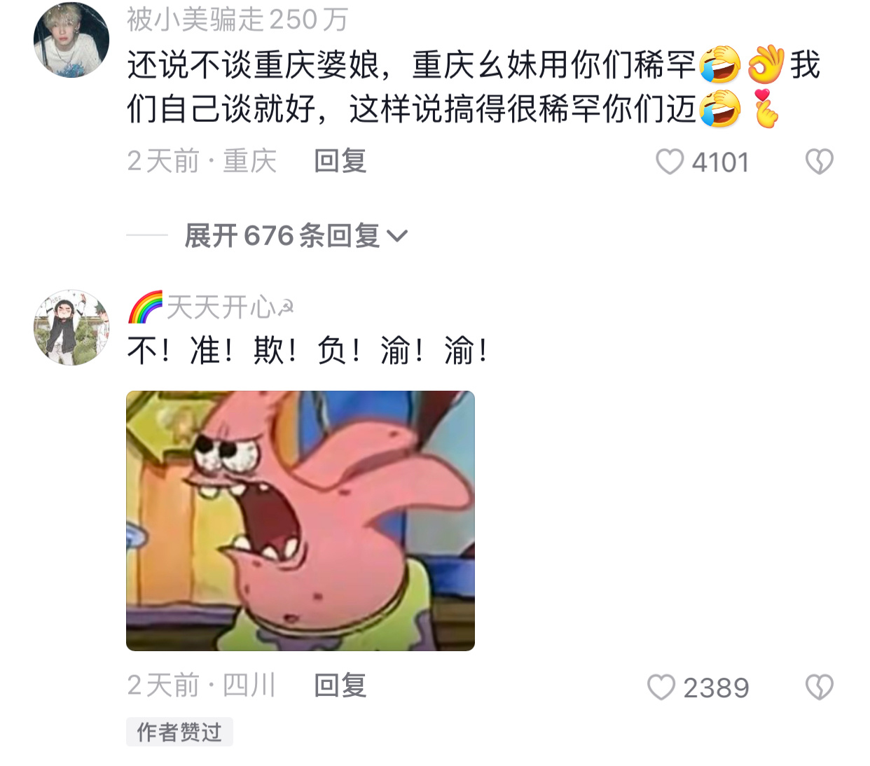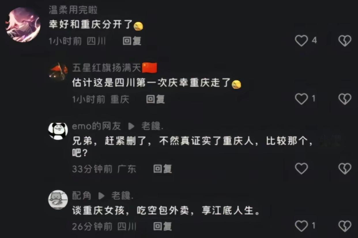 投稿,“空包之城,51w之城,谭竹之都,出生之都,陪都,重庆女人不配做中国人都是捞女都是卖的,让小日子炸**也是调侃,谁有你们抖人这么会调侃这么有“正义心”[允悲][允悲],差不多得了,谁做错就去骂谁,别上升到我们整个重庆,是,空包的是重庆商家,那点外卖的也是重庆人,抓到空包的也是我们重庆人”