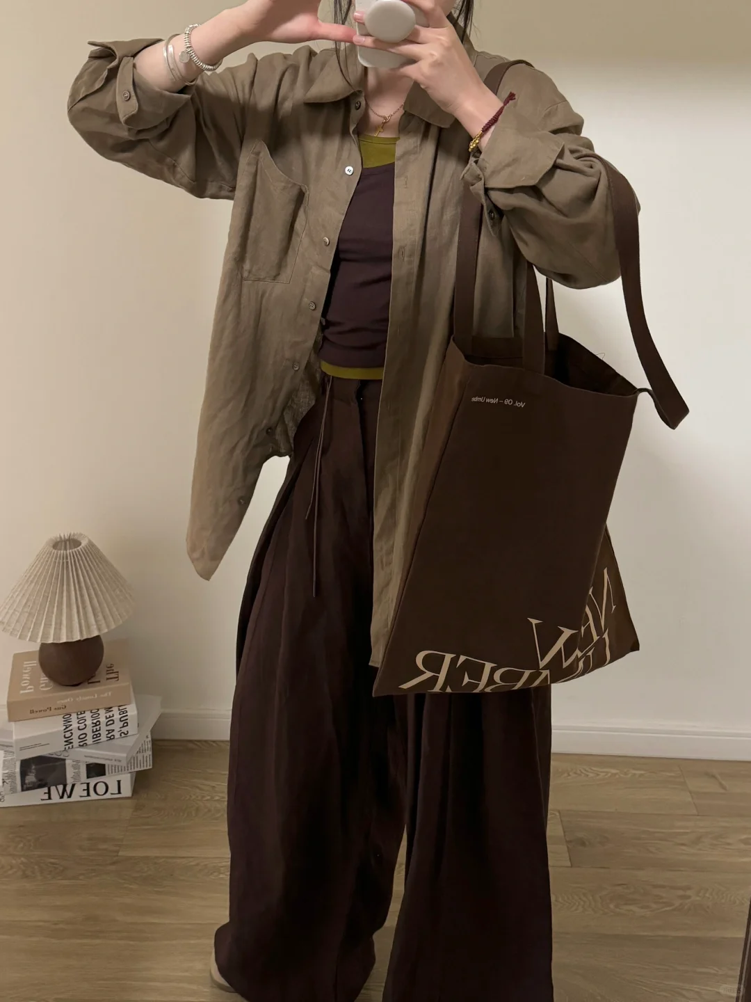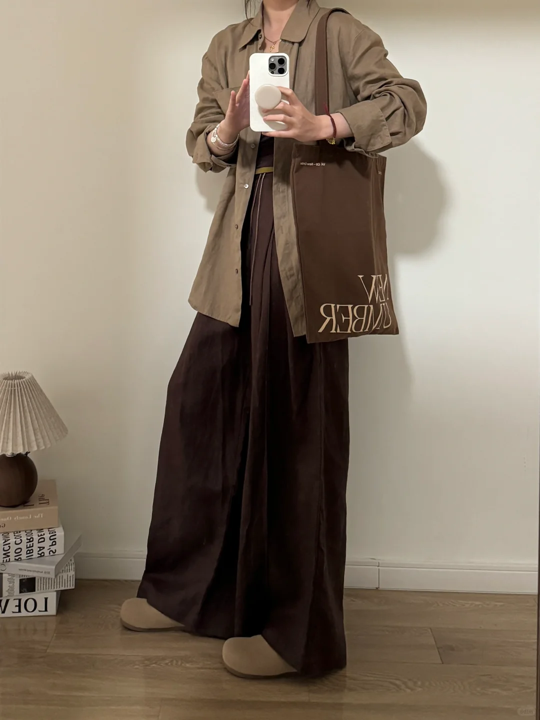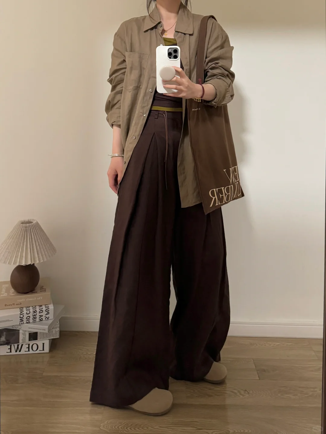 咖色棉麻衬衫+芥末绿咖背心+酒红棉麻阔腿裤 日常通勤的复古松弛的咖色系~