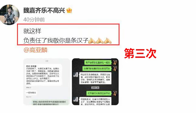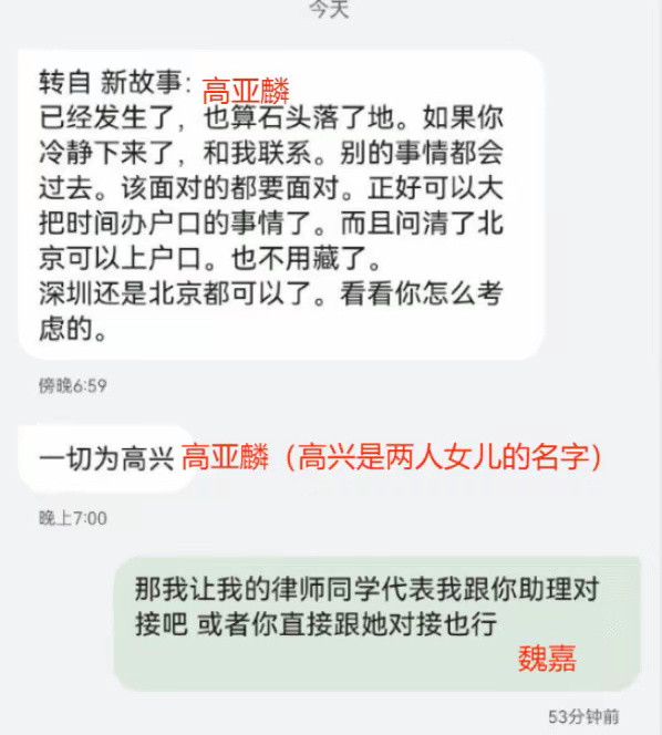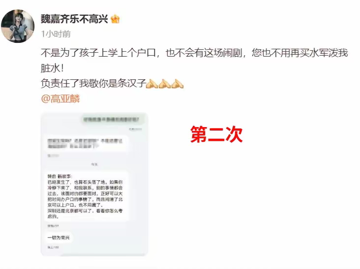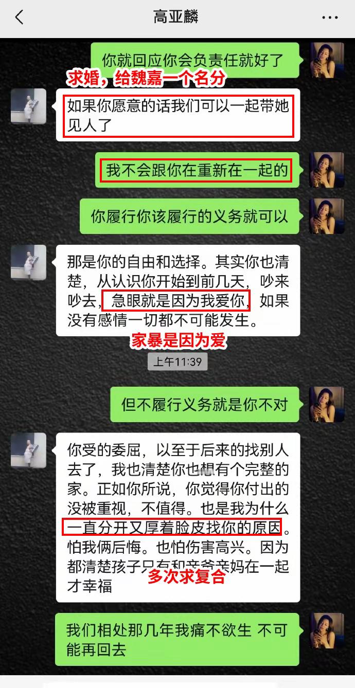 #高亚麟 急眼就是因为我爱你#魏嘉晒与高亚麟聊天记录,记录中高亚麟称,急眼就是因为我爱你,希望能和魏嘉复合,还愿意娶她,可以给孩子上北京或深圳的户口,因为孩子和亲爸亲妈在一起才幸福。魏嘉回应,不会和高亚麟重新在一起,相处的几年让自己痛不欲生。这场闹剧就是因为给孩子上学上户口,高履行义务就可以。