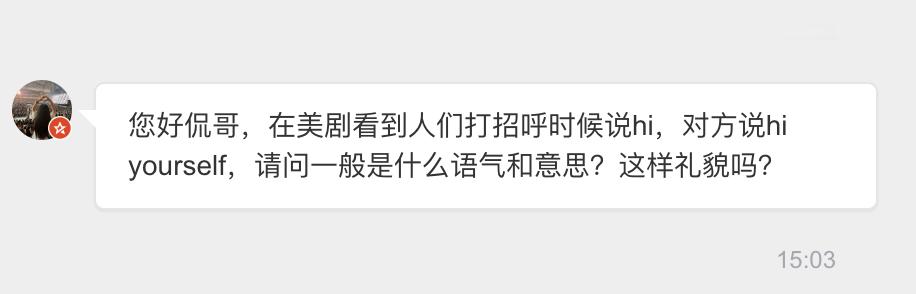 别人跟你say “hi”(你好),你可以用 hi yourself(你也好啊)来回应,属于非正式且带点幽默感的表达方式,不能说不礼貌。在美式英语中 yourself = ... to you too(也祝你...),再如别人对你说 Good luck,可以回应 Good luck yourself! [爱你][爱你] #英语口语#