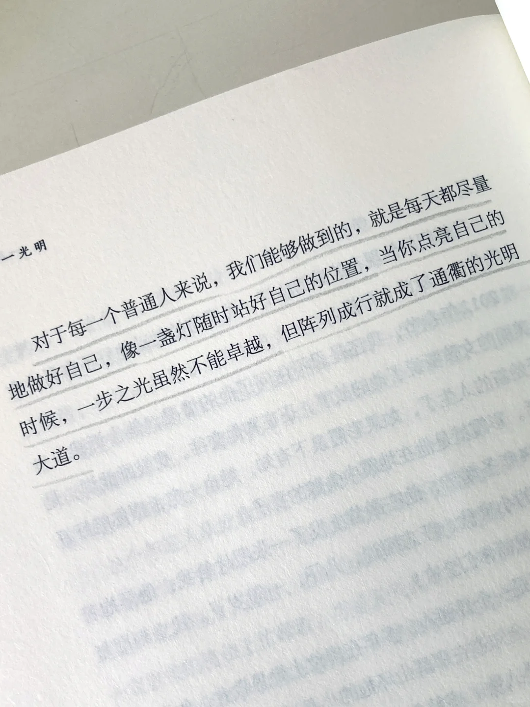 “对于每一个普通人来说,我们能够做到的,就是每天都尽量地做好自己,像一盏灯随时站好自己的位置,当你点亮自己的时候,一步之光虽然不能卓 越,但陈列成行就成了通衢的光明大道。”