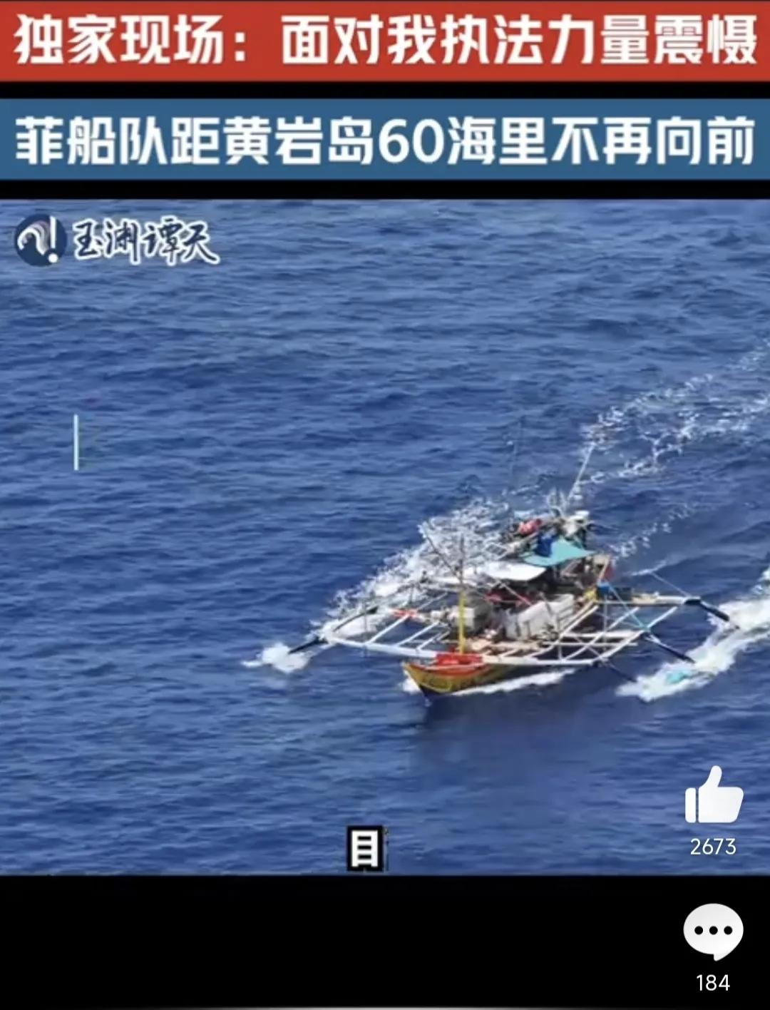 菲律宾水猴子连黄岩岛的影子都没有看到。 菲律宾船只受中方震慑已驶离。实际上,这就是一场菲律宾水猴子的作秀活动,是一场闹剧。录制直播和拍照片是主要目的,他们可能一开始就没敢硬闯黄岩岛。 大概情况是这样的:活动组织者“这里是我们的”获得了一笔经费,以及菲律宾官方的支持,搭了个草台班子,搞钱为上,组织了两艘大型渔船和超过100艘螃蟹船(装有舷外支架的小舢板),进行所谓的“和平与团结帆船比赛”,声称要强闯黄岩岛,并在黄岩岛周围安装航海标记和浮标。 由于螃蟹船太小,只适合近岸活动,不适合上百海里的航行,因此需要多次补给。这些螃蟹船刚一出菲律宾领海线就进行了第一次补给,然后大部分螃蟹船四散而去。少量船只继续航行到了距离黄岩岛60海里的位置,就发现了在周围管控的中方海空力量,这些螃蟹船再次补给燃料以后,就掉头返回了,连黄岩岛的影子都没有见到。领了美元,敷衍一下,三秒钟就结束了。 这就是一场闹剧,隔着上百公里拍了照片录了视频,就代表水猴子们去过黄岩岛了。 让中方的水炮寂寞地空等了一天一夜。 #现场视频:中方执法力量震慑菲船队#
