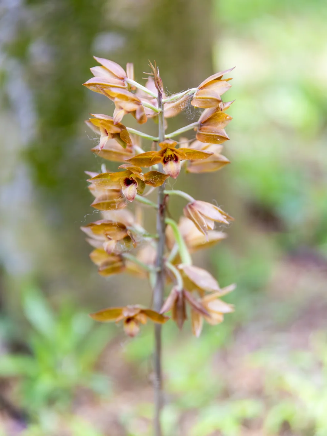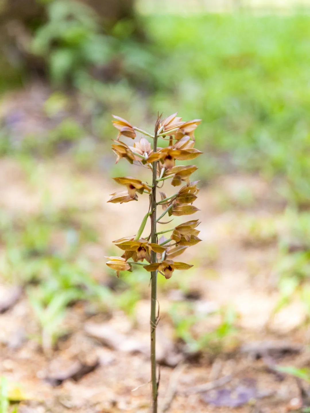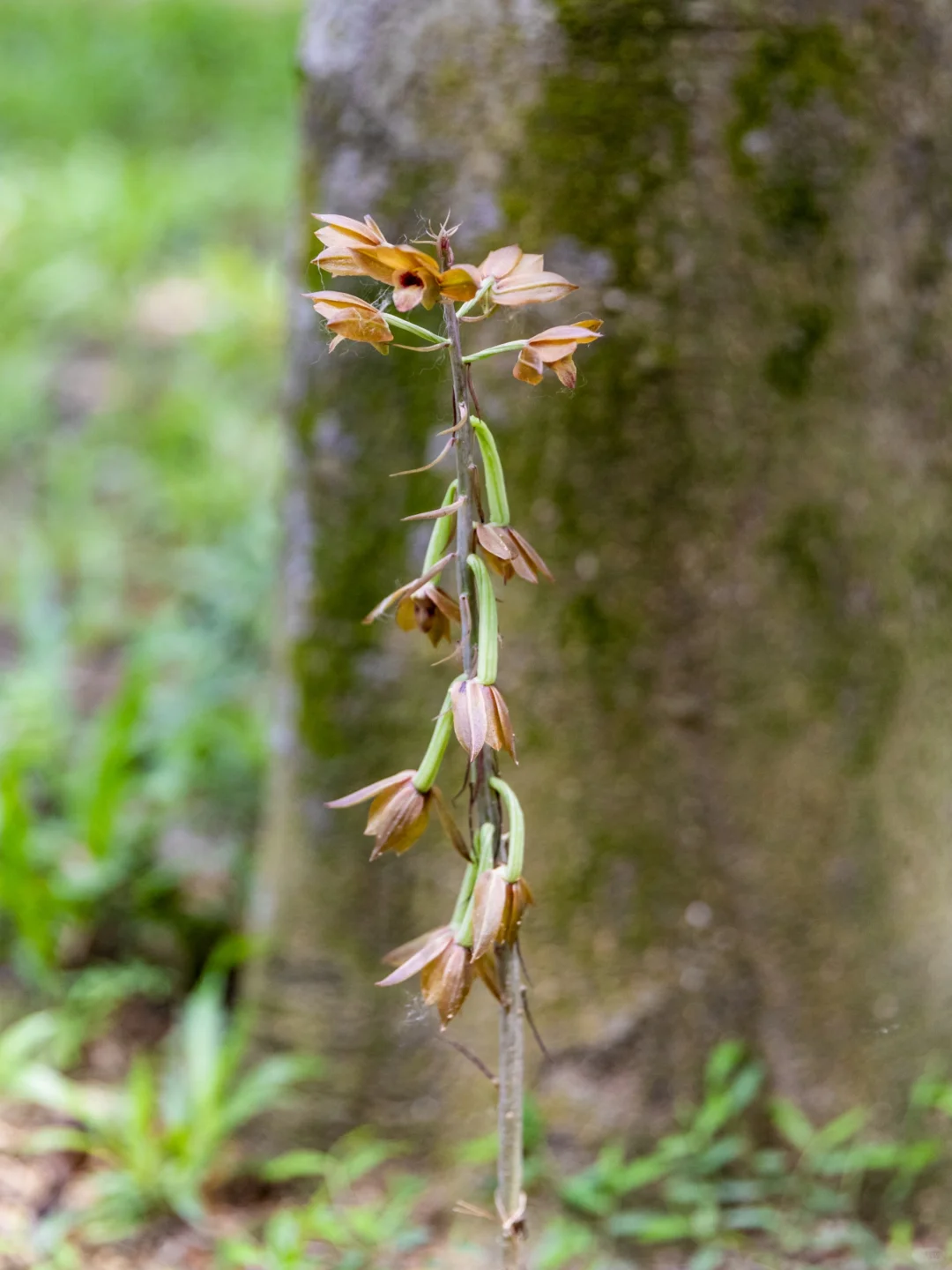 无叶美冠兰是兰科美冠兰属中的一种腐生植物,平时难以寻觅,只有在开花时才能一窥其芳容。它没有绿叶,其花葶粗壮呈褐红色,总状花序傲立,高达13厘米,可开放数朵至10余朵的花朵。一般在4-6月间盛开,花色呈褐黄,而其底部鳞茎膨大成块状,主要依赖根部土壤中的共生zhen菌,以腐生方式获取养分。