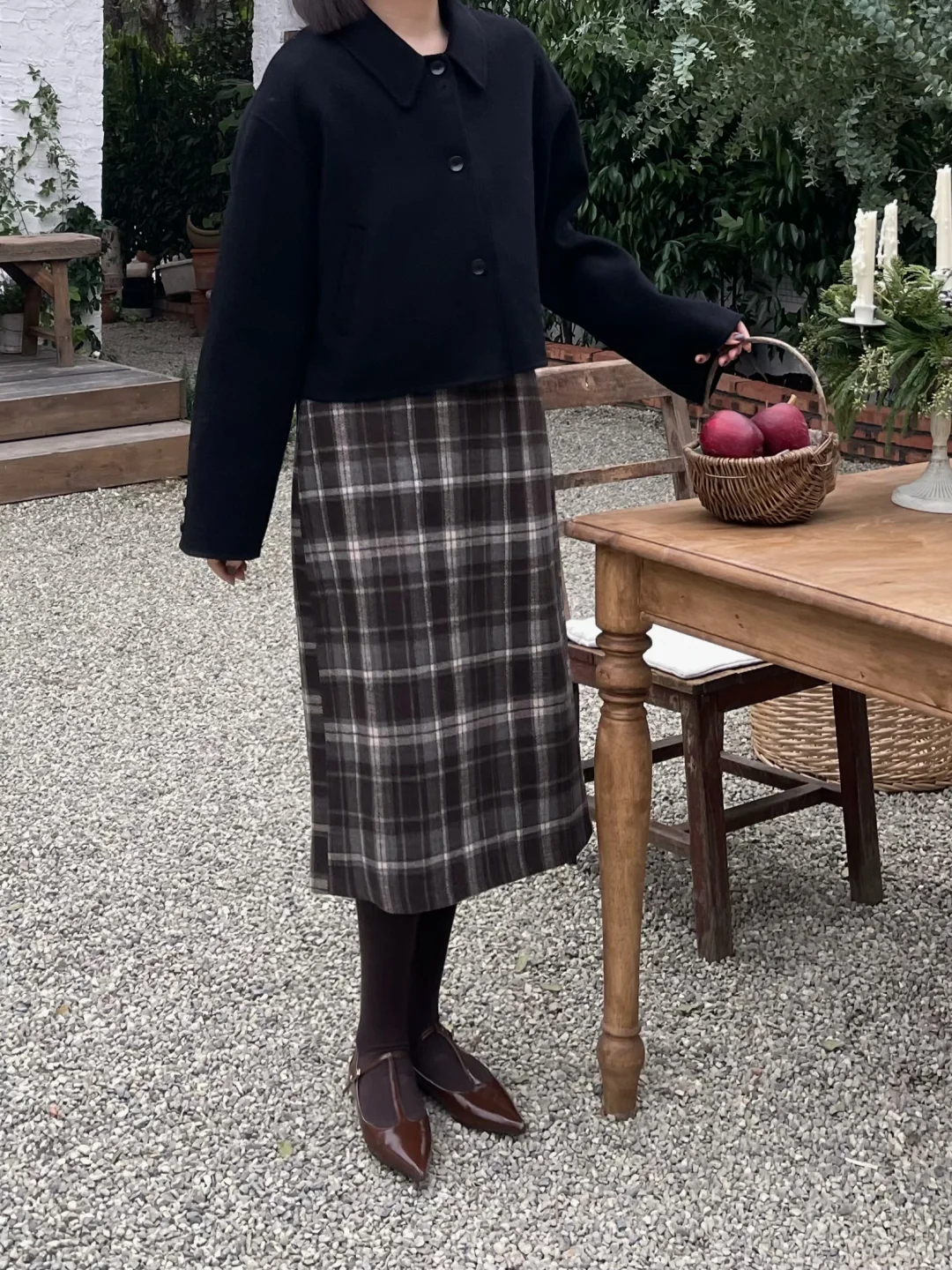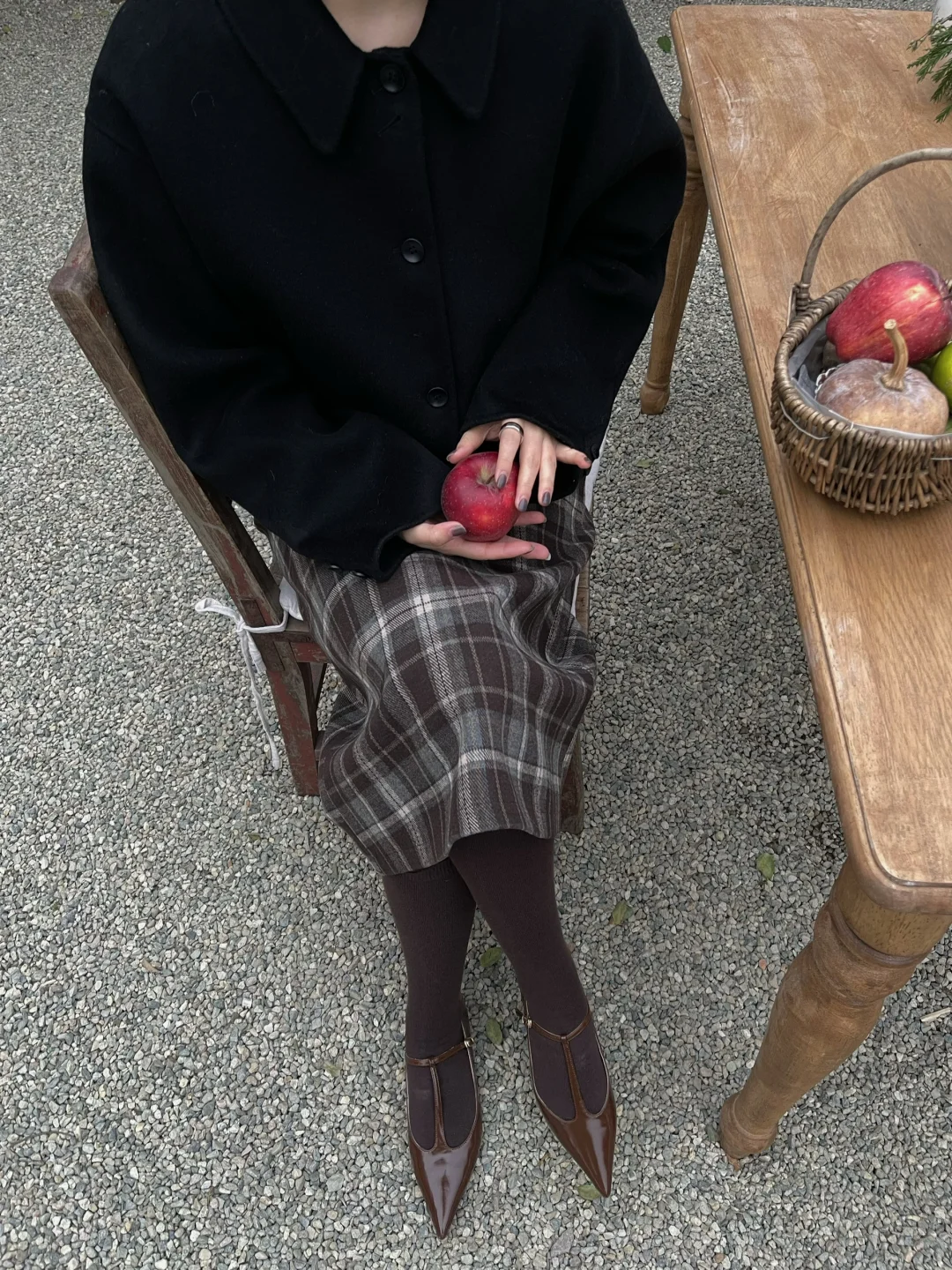 格纹半裙搭配黑色小外套 复古又不失可爱!