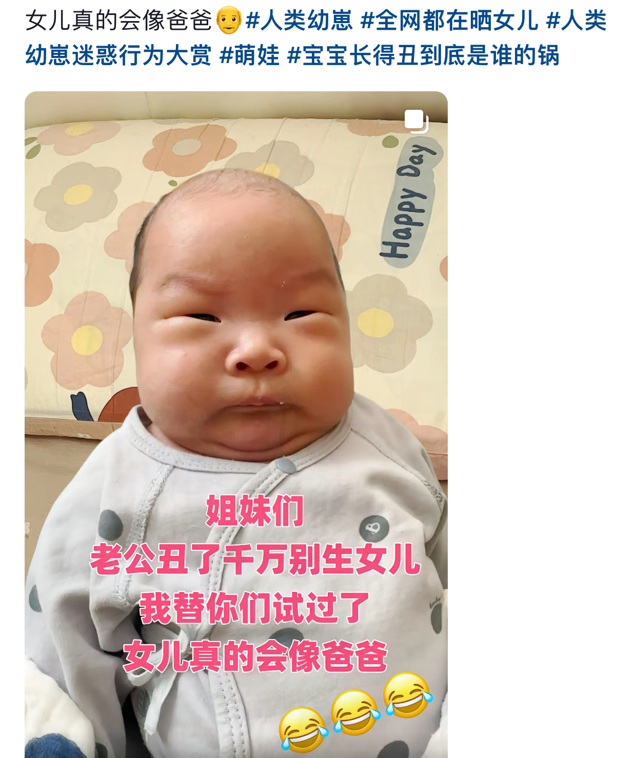 投稿,“不太理解,抖人这种流行把娃丑照发出来,说爹丑别生女儿,疯狂嫌弃的行为是啥意思……”
