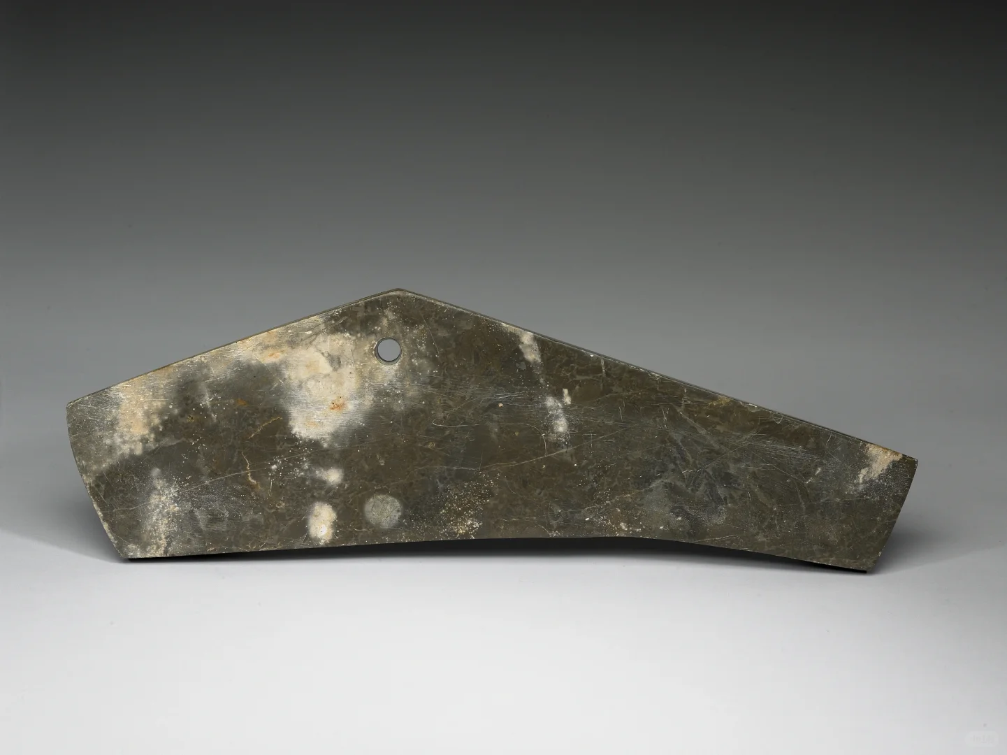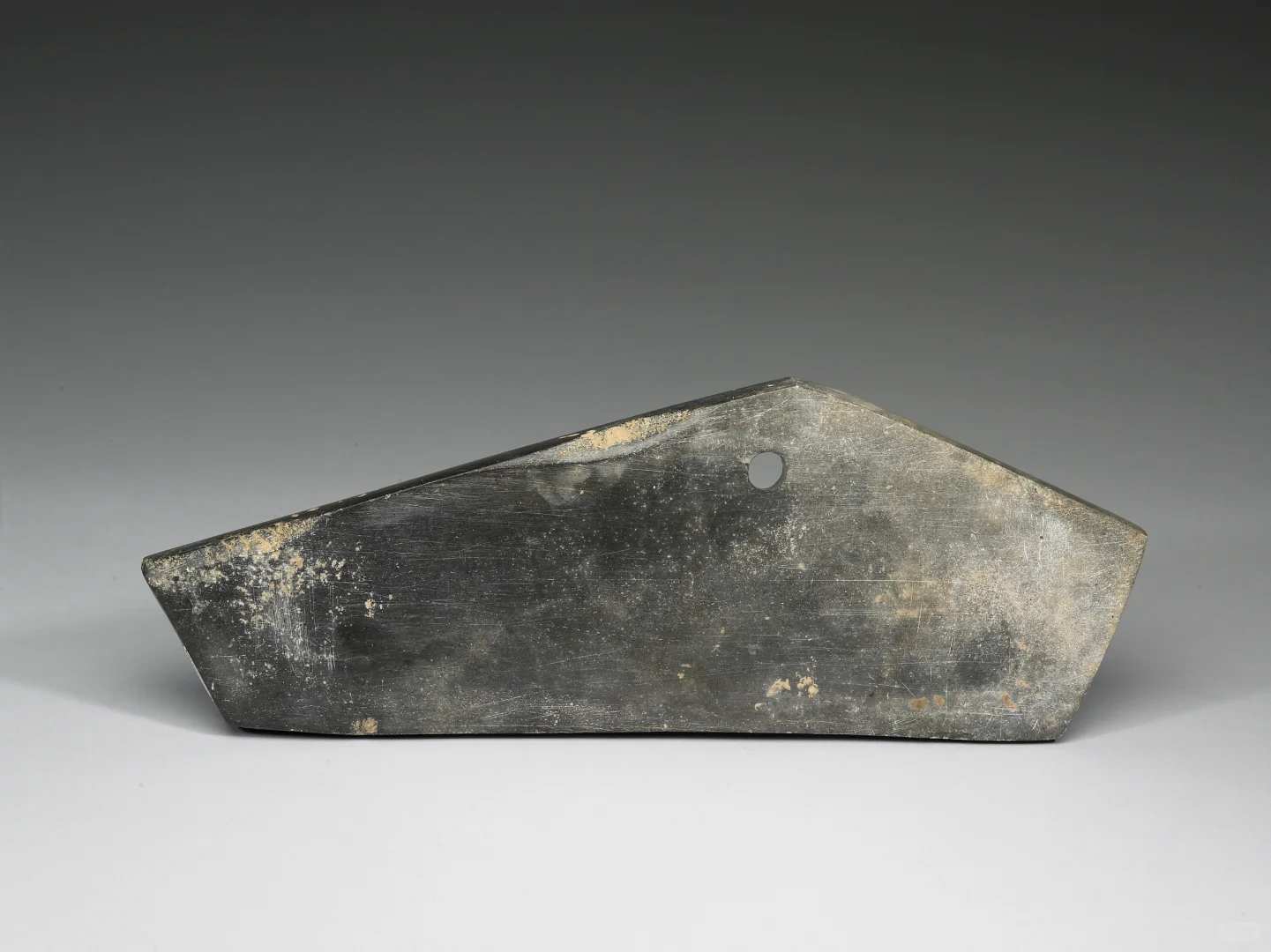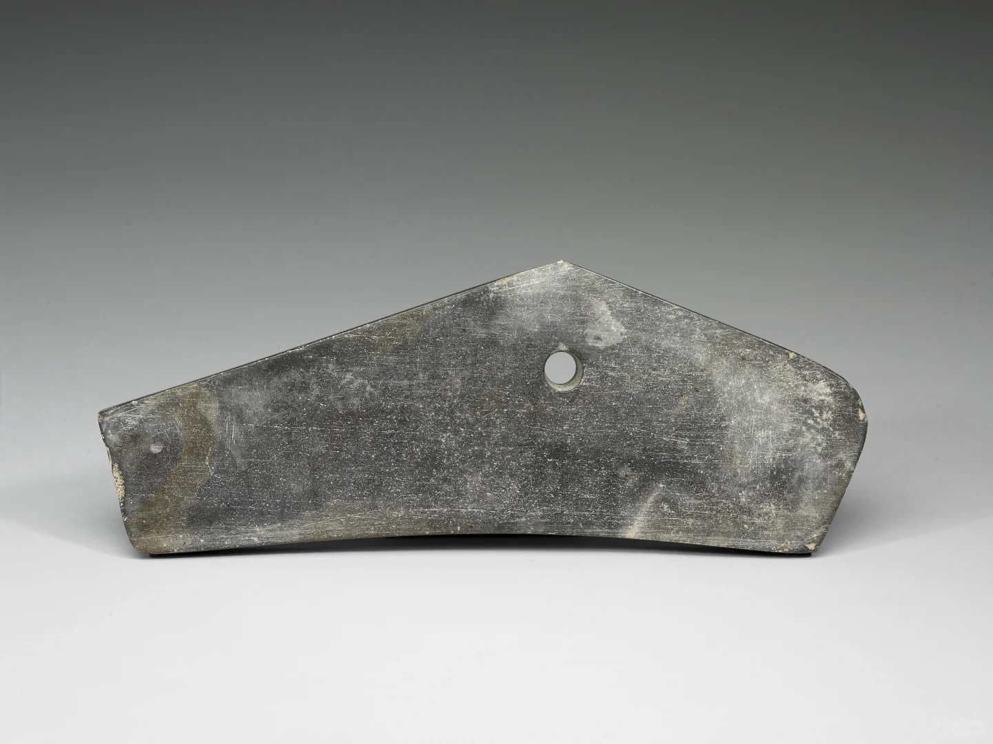 这是一组来自台北故宫博物院 所藏的玉磬,深青灰色,样式有如两端被截切一段的磬,且两端所截去的部份长短不一,若将绳系于面上的穿,被悬挂的磬更会显现其不对称的姿态、美感。磬为乐器,通常多片一组,依其大小厚薄排列悬挂,便可顺次敲打出不同音阶的声响,台北故宫博物院 所藏为十件一组,此为其中之一。