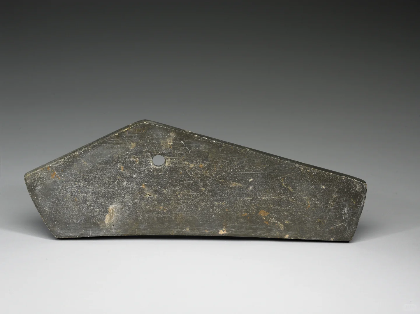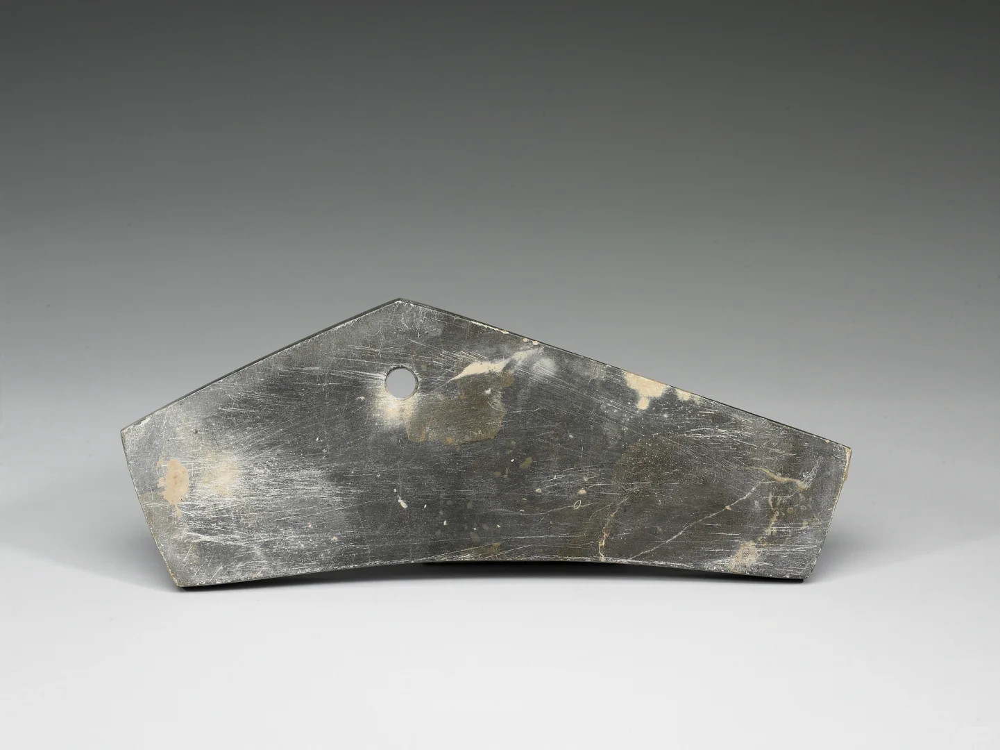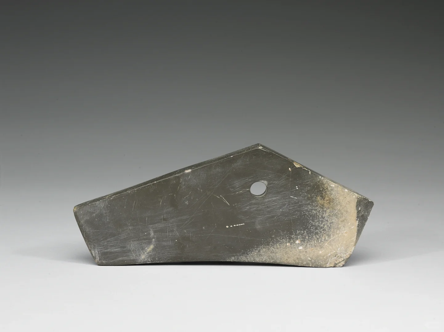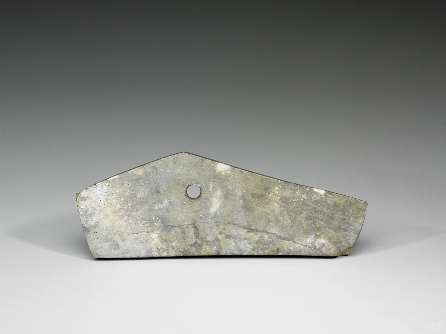 这是一组来自台北故宫博物院 所藏的玉磬,深青灰色,样式有如两端被截切一段的磬,且两端所截去的部份长短不一,若将绳系于面上的穿,被悬挂的磬更会显现其不对称的姿态、美感。磬为乐器,通常多片一组,依其大小厚薄排列悬挂,便可顺次敲打出不同音阶的声响,台北故宫博物院 所藏为十件一组,此为其中之一。