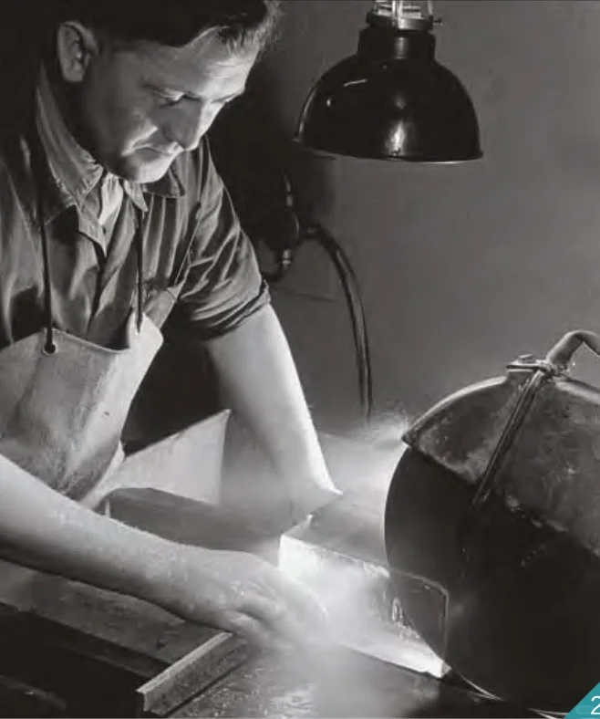 图8:加工镜片流程中,徕卡技师正用金刚石电锯,依照所需要厚度将玻璃块切成玻璃板