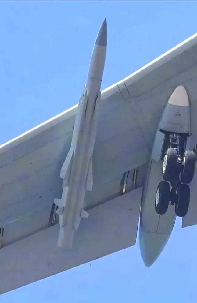 仔细观察会发现,空射型的鹰击-12超音速反舰导弹与舰舰和岸舰型的鹰击-12有很大区别。 首先是导弹尾部的助推器明显缩短。由于是空射型号,轰-6J轰炸机会给鹰击-12导弹带来一定的初始速度,导弹发射以后加速到超音速以后再启动液体冲鸭发动机的能量需求比较小,因此助推器就不用那么大。 其次是空射鹰击-12的4个矩形进气道的前端装上了非常尖锐的整流罩,在载机飞行时可减少阻力,发射以后可以再抛掉。 最后就是空射型鹰击-12的尾翼不可折叠,由舰舰型的可折叠式尾翼改为固定式。