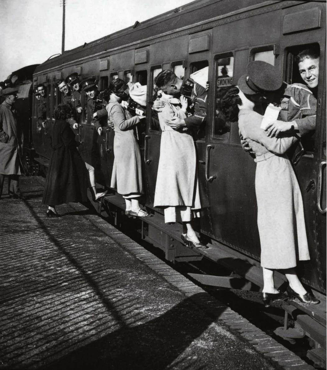 1939年,前往前线的英国士兵在火车开动前依依不舍地与心上人吻别