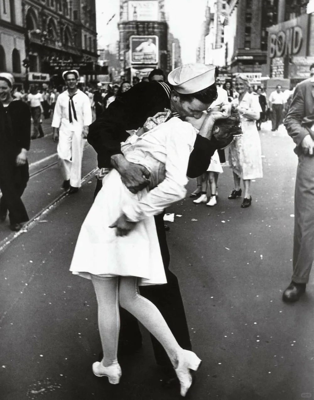 1945年8月14日,纽约时代广场上欢庆的水兵亲吻身边的一位女护士,《生活》杂志的摄影师抓住了这个瞬间,于是就有了这张传世的经典“胜利之吻”