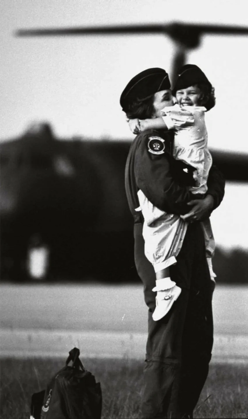 1990年,从前线归来的女飞行员在机场温柔地亲吻自己的女儿,小女孩脸上的笑容表露出见到母亲后的快乐