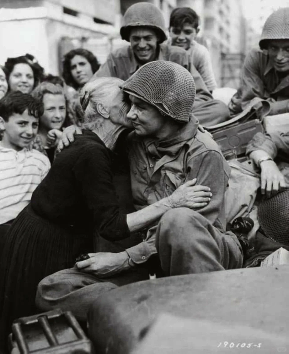 1944年,二战期间,一名老妇人亲吻登陆意大利的美军士兵,对他们表示感谢