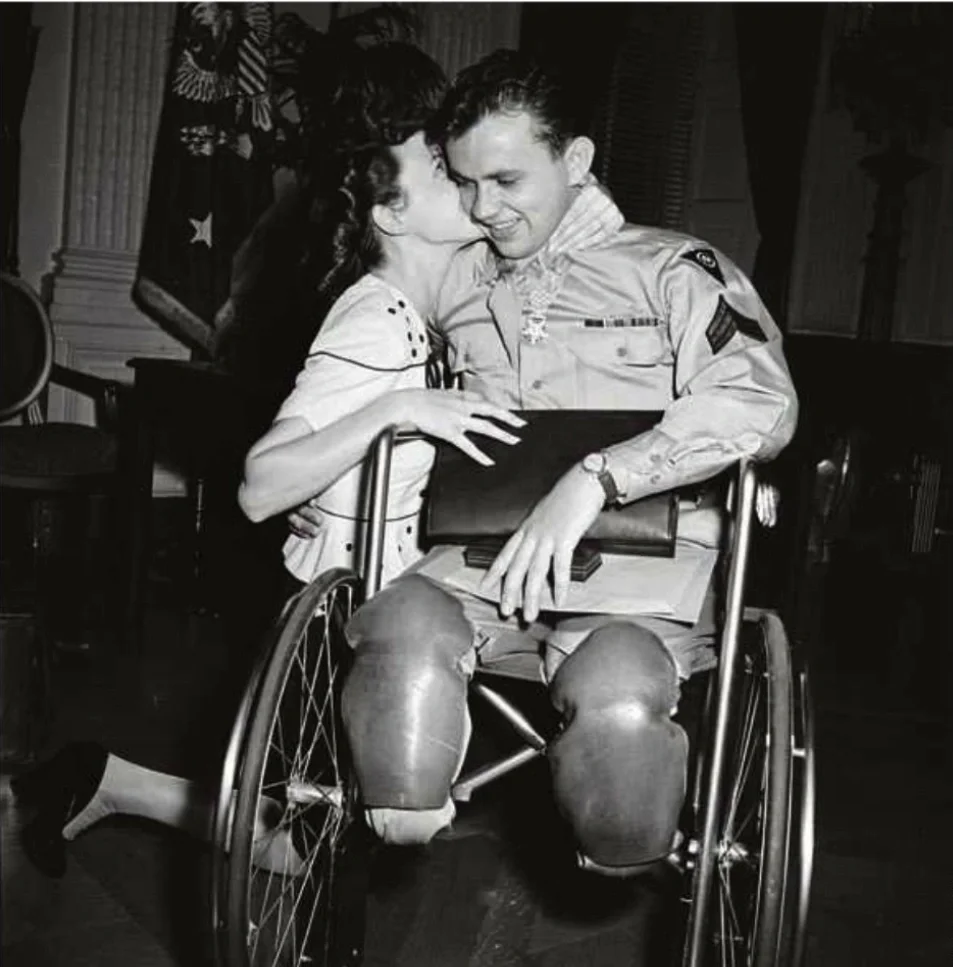1945年9月,一个美国妇女亲吻在二战中受伤致残的丈夫,他脖子上挂着杜鲁门总统颁发的荣誉勋章