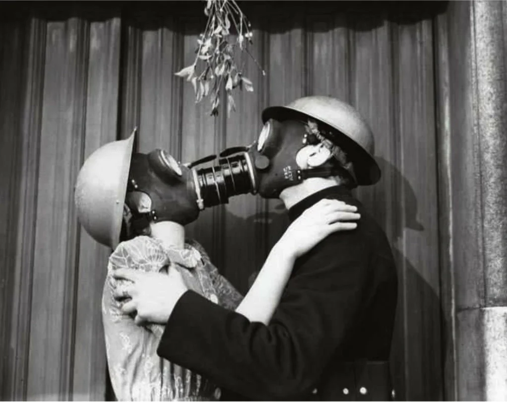 1940年,战争中的一对英国夫妇。即使戴着防毒面具,仍然挡不住相爱的人接吻
