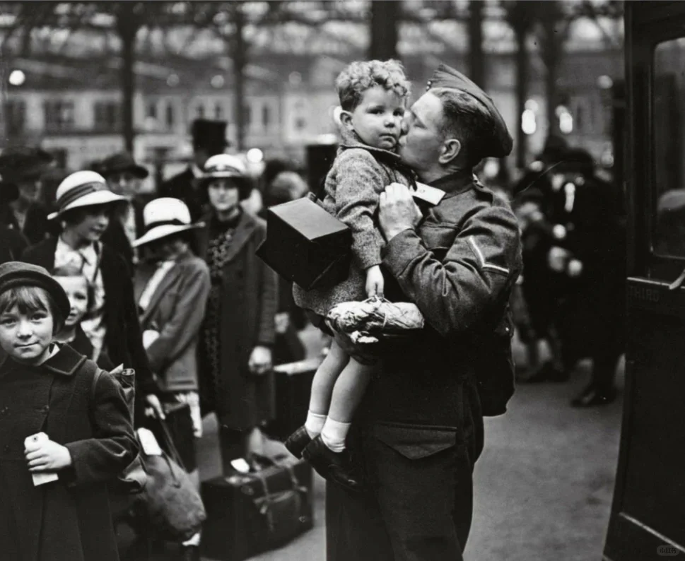 1940年1月,即将告别亲人的英国士兵亲物自己的儿子,再坚强的外表也掩饰不住父亲的慈爱
