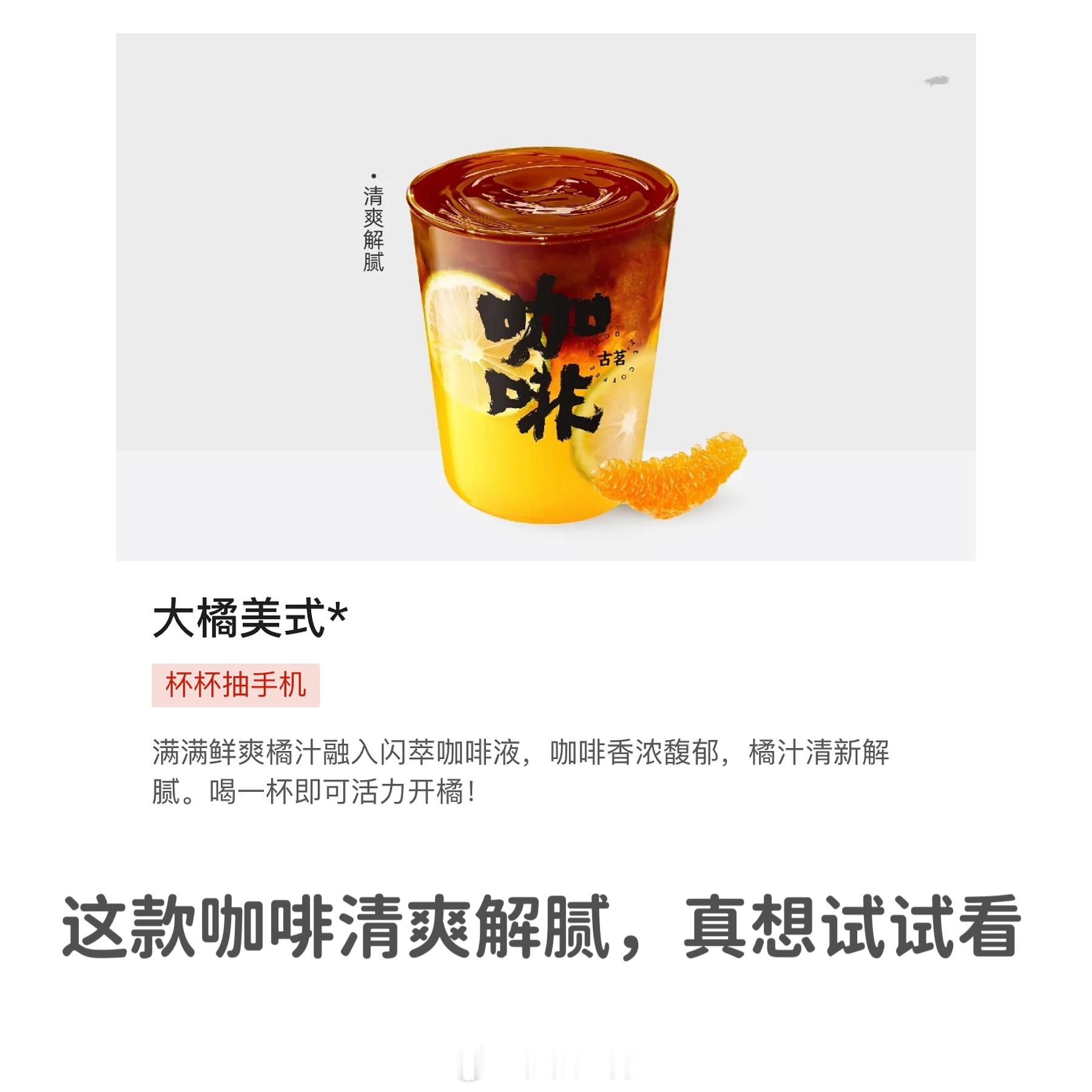 大橘美式,闪萃咖啡液+鲜爽的橘汁,清新解腻,一杯就可以活力开橘(局)。