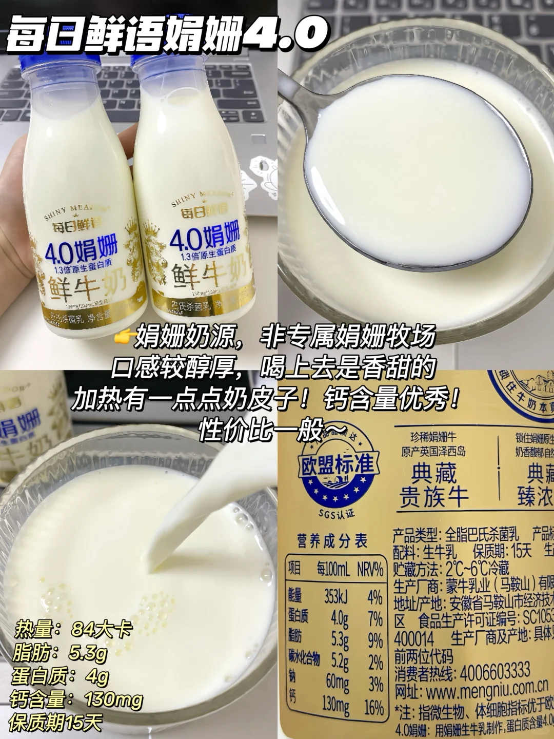 口感较醇厚,喝上去是香甜的,有🤏奶腥味还能接受!加热有一点点奶皮子!钙含量优秀!性价比一般~保质期15天
