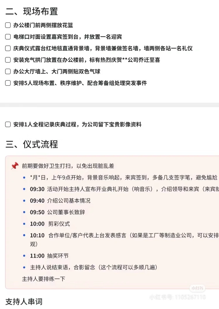 1⃣️买仪式道具,确定好预算 2⃣️茶歇➕伴手礼 3⃣️理顺整个流程,多彩排几遍, 暖场背景音乐🎵 Horizon Inspire Legacy 开场音乐🎵 Red carpets Liberators The heart of a champion 4⃣️串词致辞提前准备,多多演练,避免卡壳尴尬