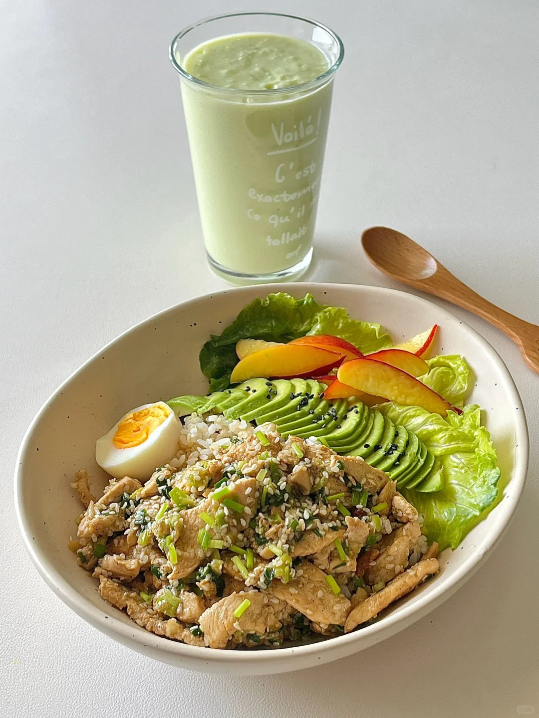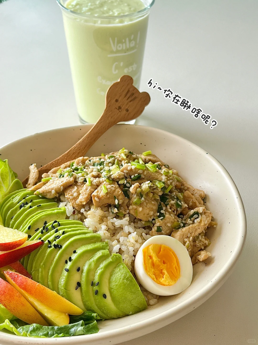 用盐葱牛肉的方子做了盐葱鸡肉饭 虽然没有牛肉那么浓郁,嫩嫩滑滑的也很好吃! 关键是简单省事儿!大家可以试试! - 🍗食材: 鸡胸肉|小葱|鸡蛋|生菜|牛油果|油桃|米饭|熟芝麻|黑胡椒 📄做法:在p5 调好盐葱酱料一起炒就行,有手就会! 盐葱酱真是炒啥都好吃 太下饭了✌️ 😋祝大家吃的开心!