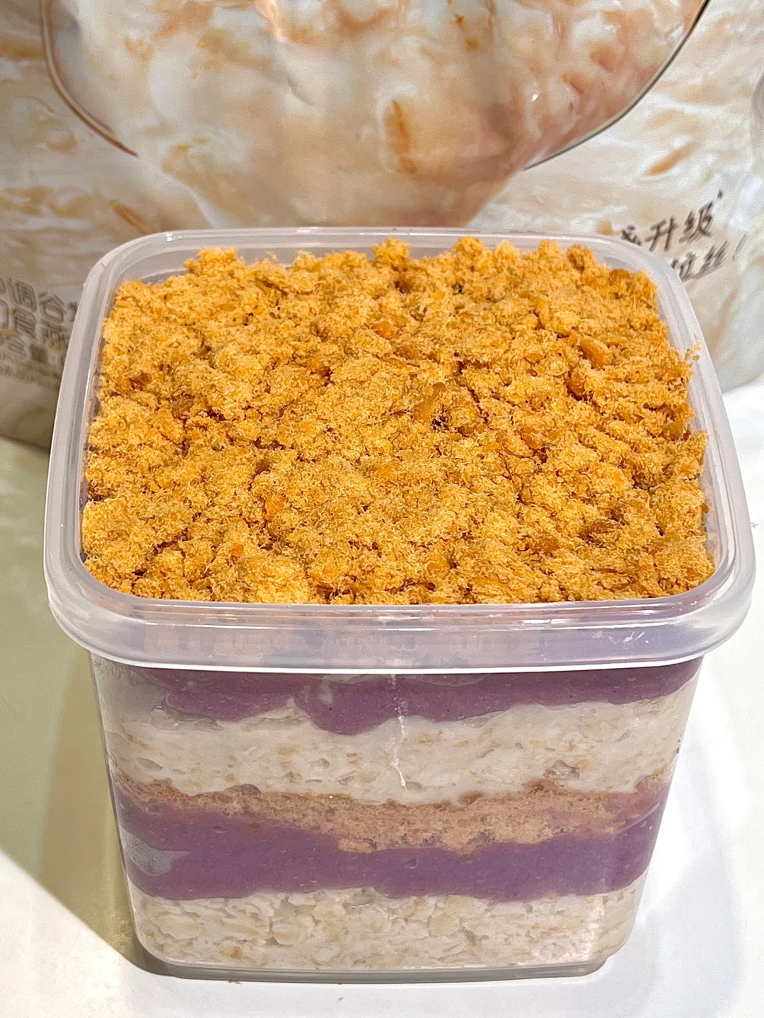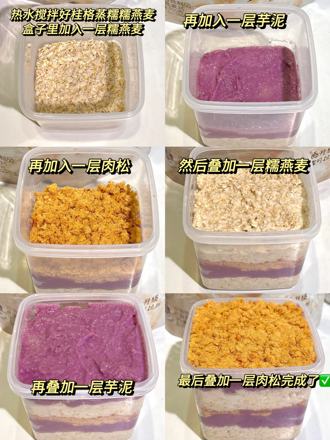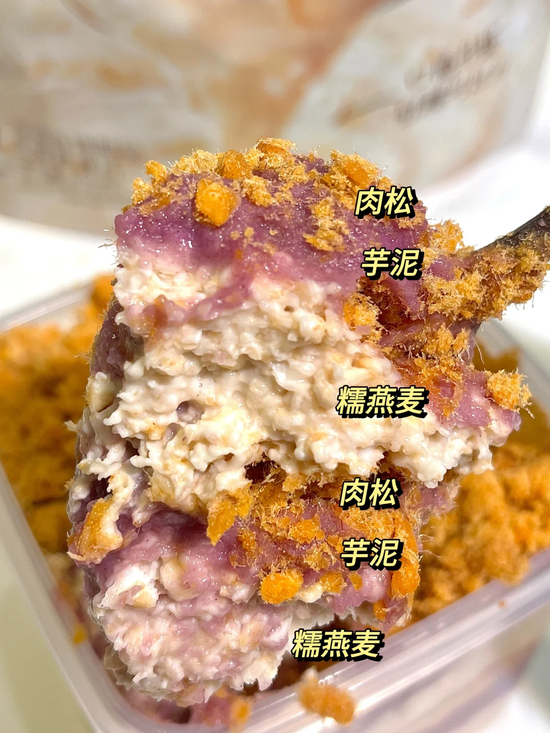 软糯糯的糯燕麦搭配芋泥肉松,超级绵密的口感!控制期!晚餐做一个糯燕麦盒子!轻卡好吃又方便!我觉得饱腹感也十足,简直yyds
