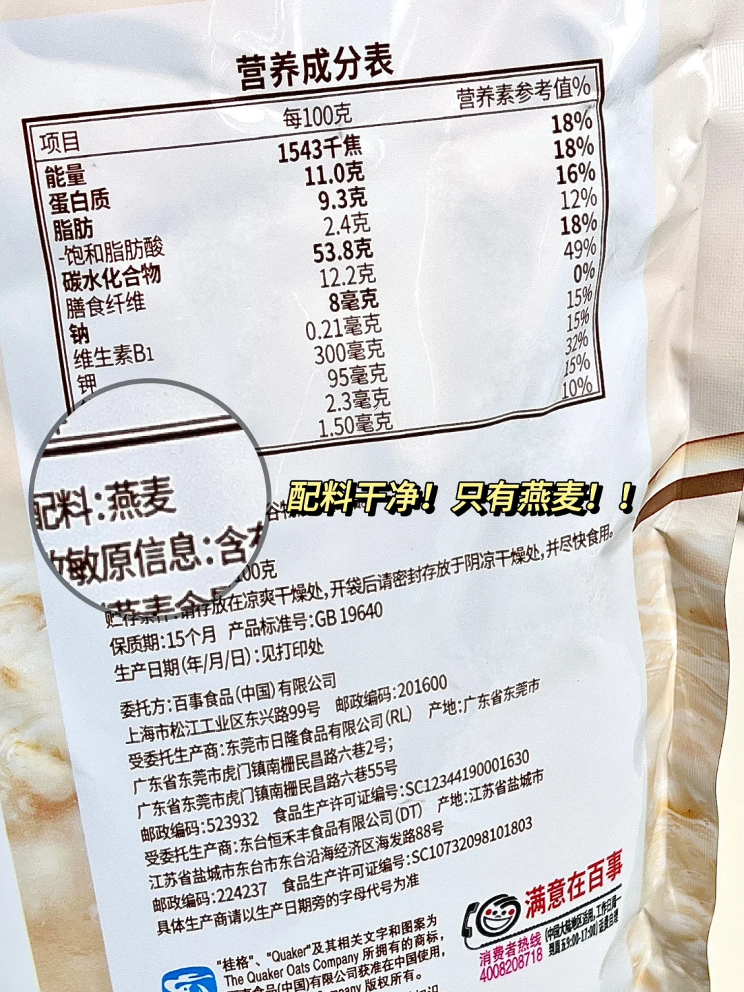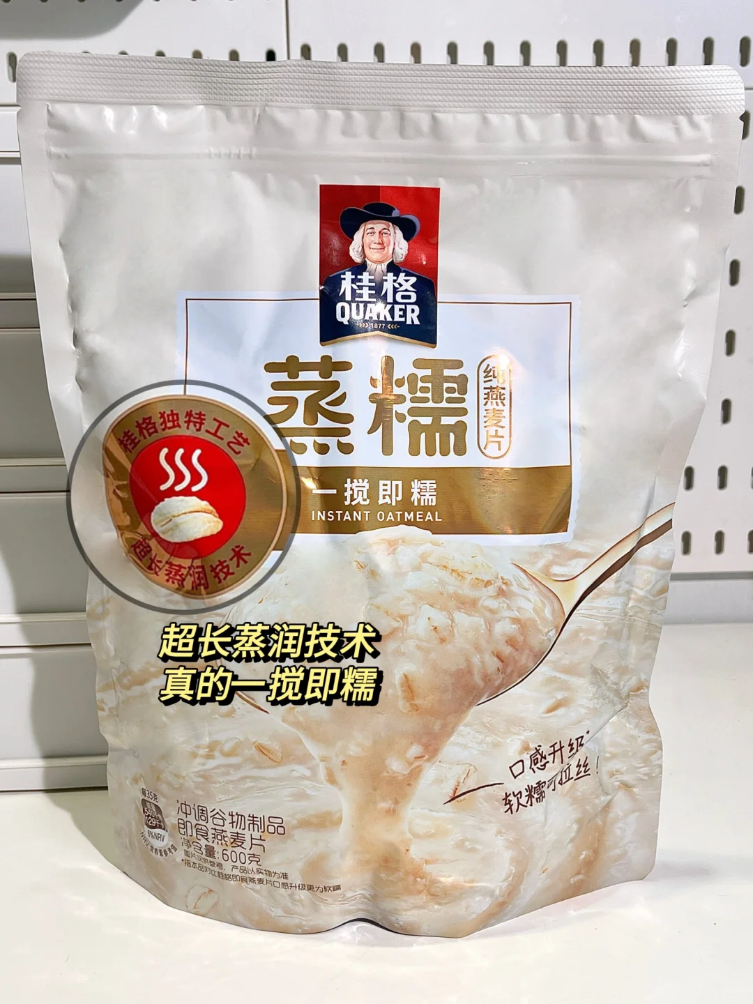 配料也很干净!只有燕麦,还特含桂格纤维Q益生元,桂格独特的超长蒸润技术让糯燕麦随便用热水搅一搅就有很绵密软糯的口感!很方便!