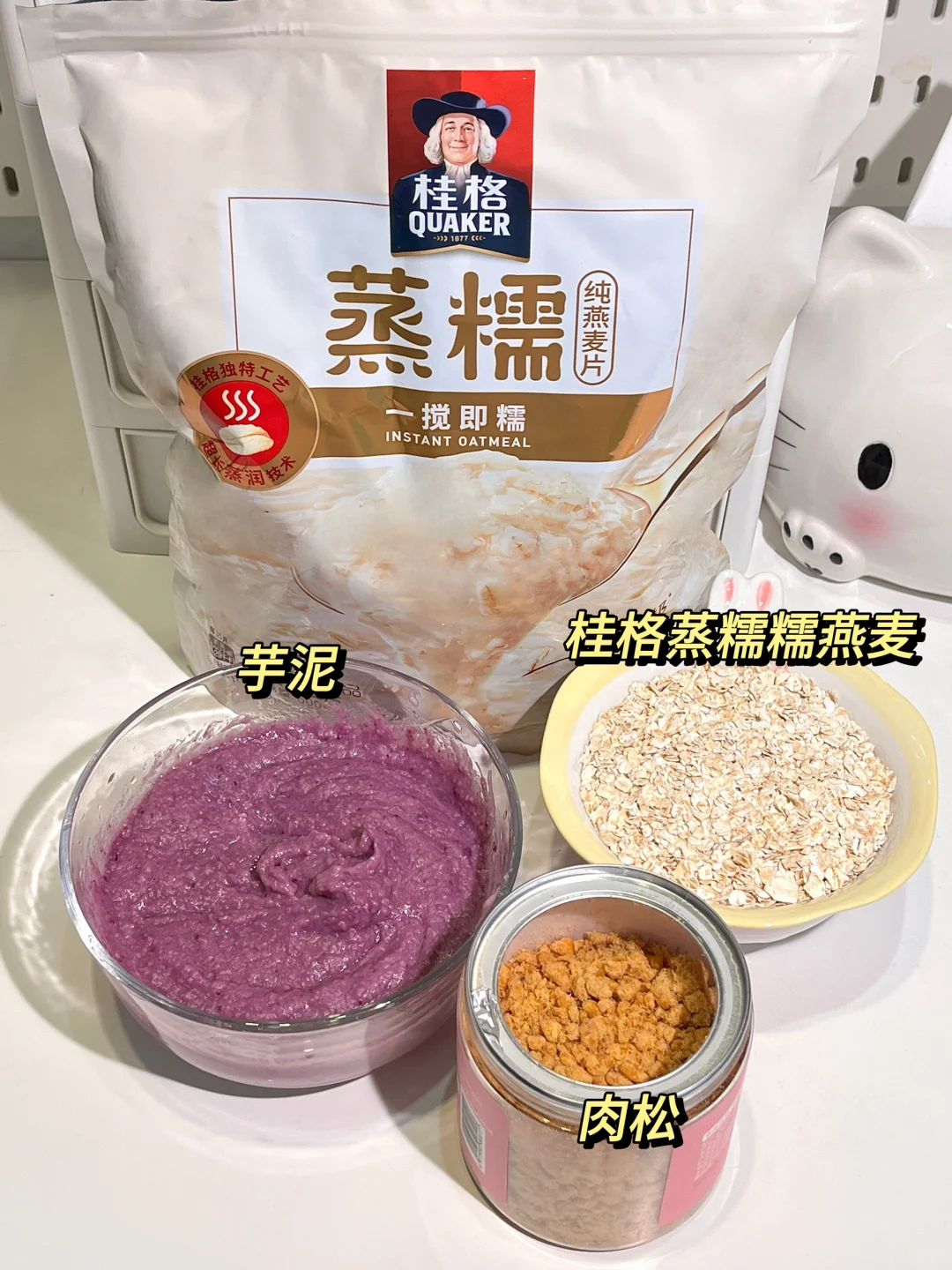 材料:桂格蒸糯糯燕麦、芋头、紫薯粉、肉松