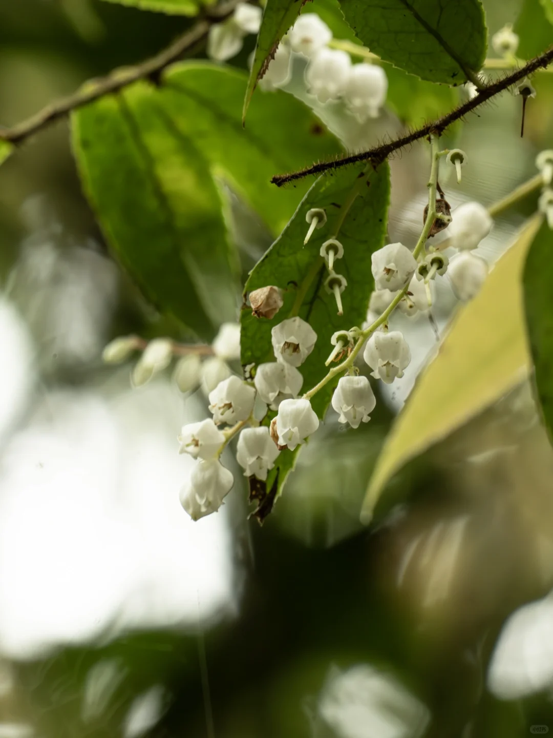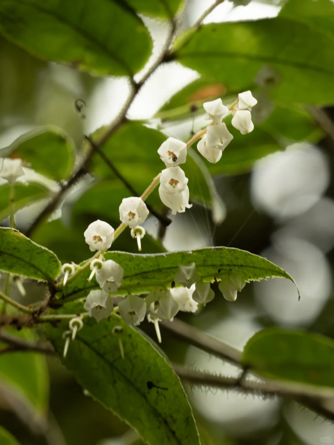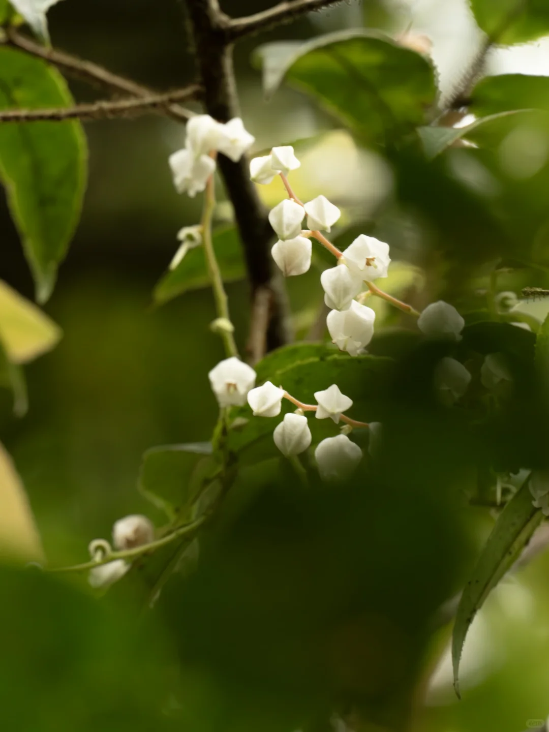 终于,在一个比较空旷的林间,它就出现在了我的眼前,是你呀,江南越橘。它白色的小花像是铃兰一样一串串的开放着,起风时,这一个个的小铃铛便开始叮铃铃地摇摆着,太美了,同行的伙伴也忍不住为它停留,为它感叹。