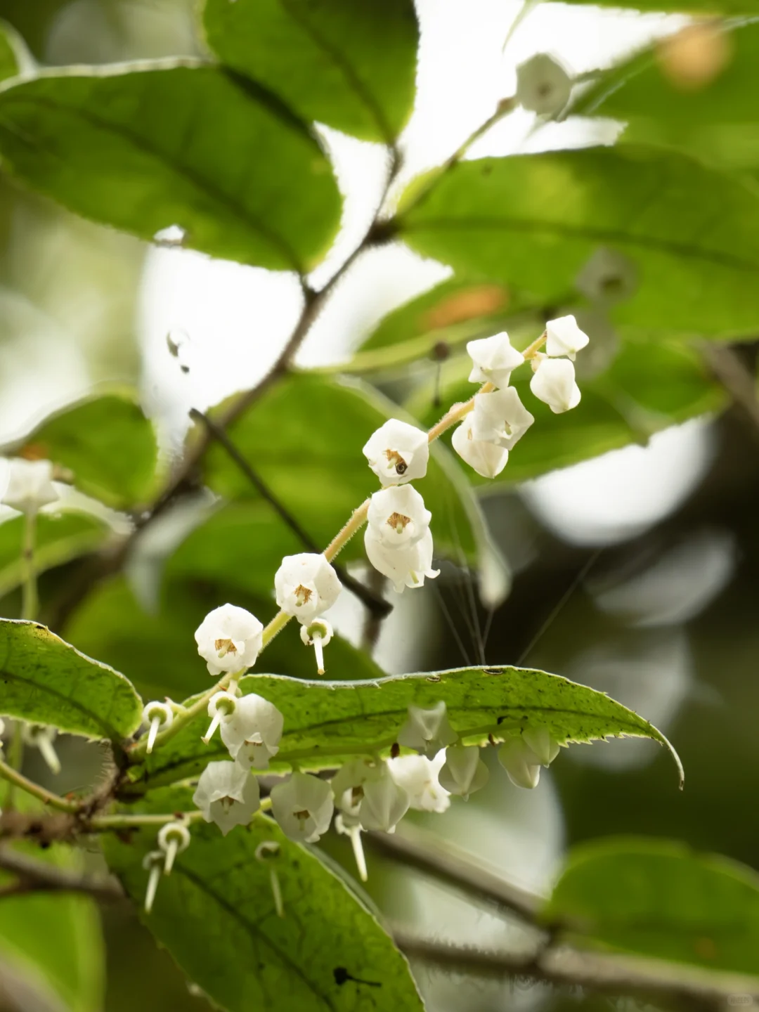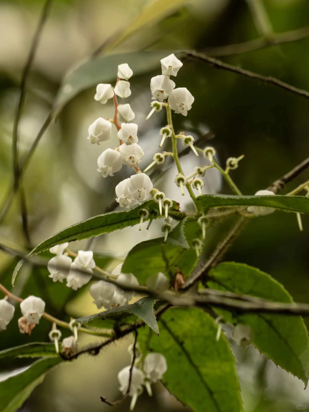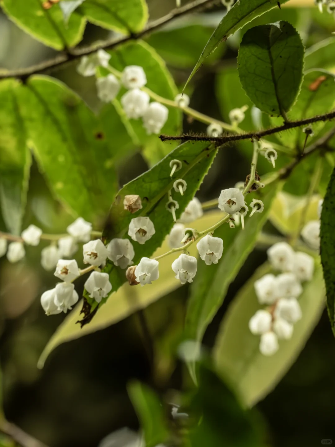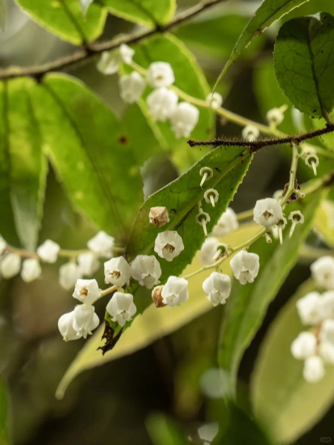 终于,在一个比较空旷的林间,它就出现在了我的眼前,是你呀,江南越橘。它白色的小花像是铃兰一样一串串的开放着,起风时,这一个个的小铃铛便开始叮铃铃地摇摆着,太美了,同行的伙伴也忍不住为它停留,为它感叹。