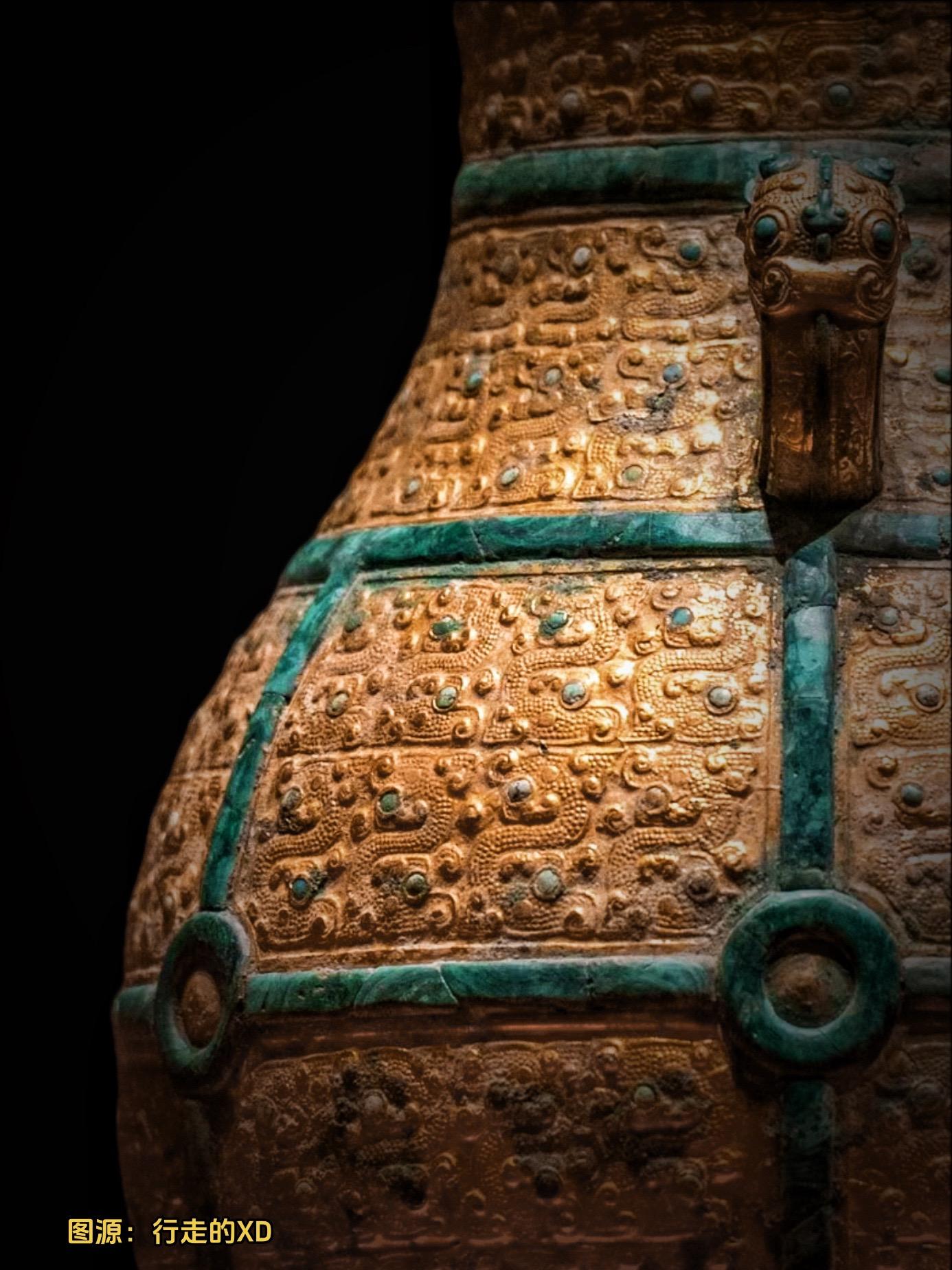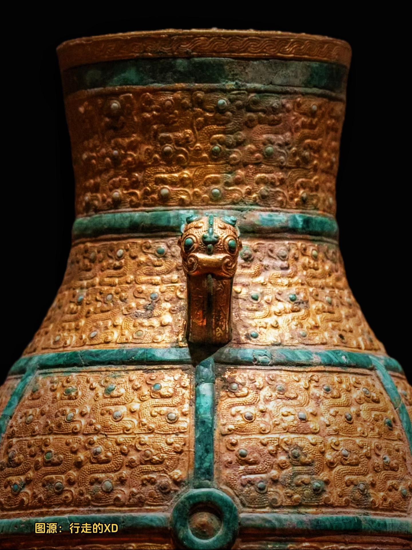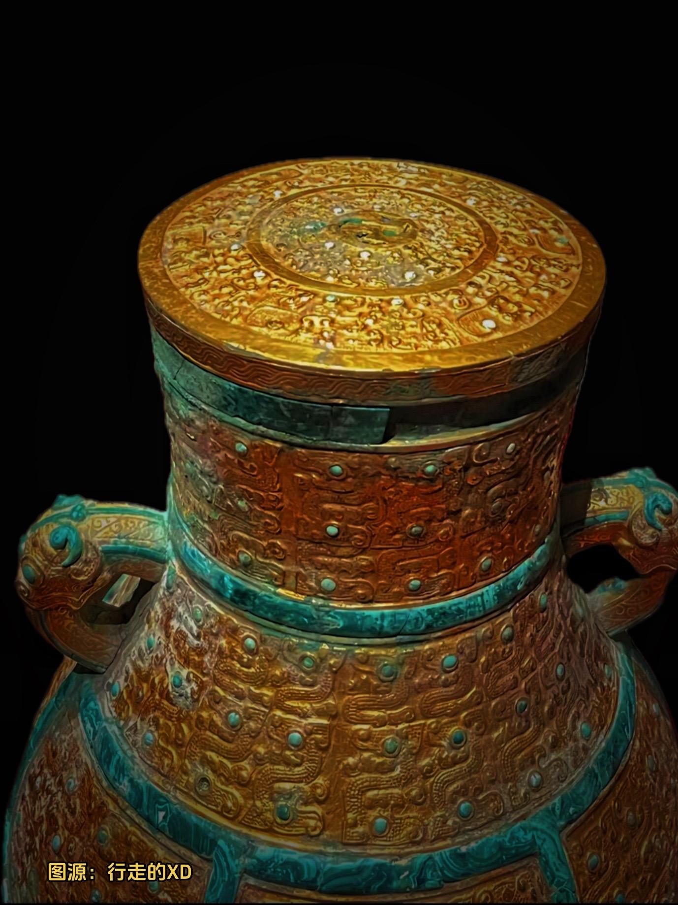 青铜壶采用贴金(或包金)工艺 “coveringthe body with gold sheet”