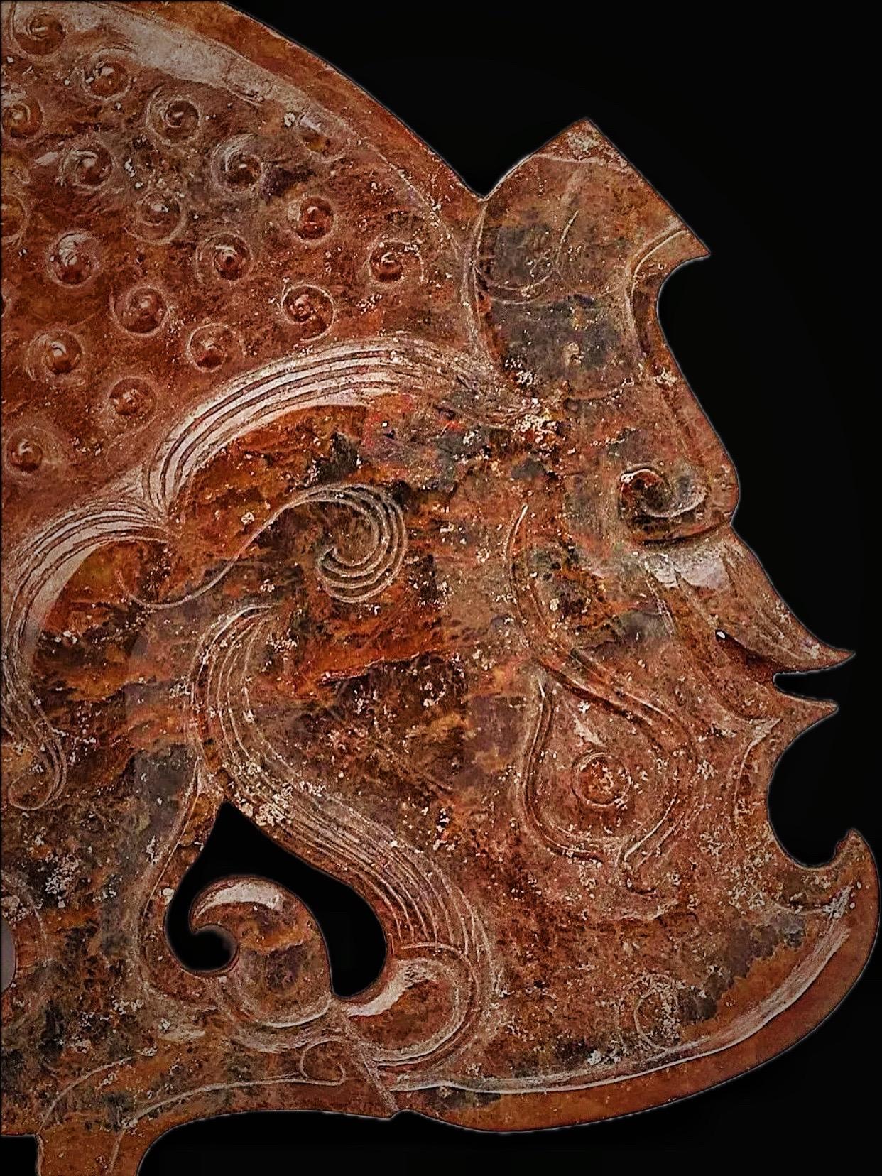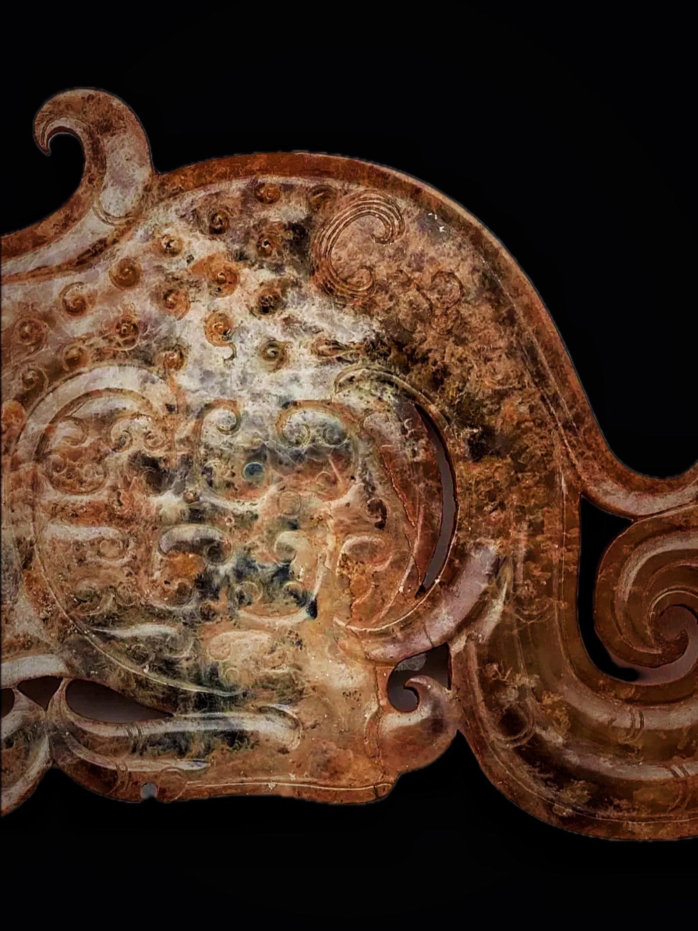 战国(公元前475年一公元前221年)玉虎形佩为一对,高9.5厘米、宽22.5厘米、厚0.5厘米,和田黄玉质,全器土沁成深、浅士褐色,可能出自洛阳金村大墓,现藏于美国弗利尔美术馆